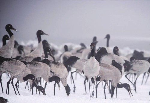 云南省昭通市大山包黑颈鹤国家级自然保护区建于2003年,近年来,为保护和扩大黑颈鹤的栖息地,当地开展生态修复、食物源基地建设等生态项目。据保护区管理局介绍,目前有1400多只黑颈鹤在此越冬。黑颈鹤是珍稀濒危动物,被誉为“鸟类大熊猫”,是国家一级保护动物。图为黑颈鹤在大山包大海子湿地嬉戏、觅食。