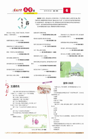 编者按:飞花令,原本是古人行酒令时的一个文字游戏,源自古人的诗词之趣,得名于唐代诗人韩翃《寒食》中的名句“春城无处不飞花”。行飞花令时可选用诗词曲中的句子,但选择的句子一般不超过七个字。《中国诗词大会》等诗词综艺栏目也引进并改良了“飞花令”,选手在规定时间内说出含有规定关键字的诗句即可。本栏目每周会推出飞花令,帮助同学们积累古诗词佳句。 碧玉妆成一树高,万条垂下绿丝绦。不知细叶谁裁出,二月春风似剪刀。 ——唐 贺知章《咏柳》 春潮带雨晚来急,野渡无人舟自横。 ——唐 韦应物《滁州西涧》 春蚕到死丝方尽,蜡炬成灰泪始干。 ——唐 李商隐《无题·相见时难别亦难》 最是一年春好处,绝胜烟柳满皇都。 ——唐 韩愈《初春小雨》 春风如醇酒,著物物不知。 ——宋 程致道《过红梅阁》 春风贺喜无言语,排比花枝满杏园。 ——唐 赵嘏《喜张濆及第》 春风春雨花经眼,江北江南水拍天。 ——宋 黄庭坚《次元明韵寄子由》 春风不相识,何事入罗帏? ——唐 李白《春思》 池塘生春草,园柳变鸣禽。 ——南北朝 谢灵运《登池上楼》 朝来新火起新烟,湖色春光净客船。 ——唐 杜甫《清明二首》 春风又绿江南岸,明月何时照我还? ——宋 王安石《泊船瓜洲》 长江一帆远,落日五湖春。 ——唐 刘长卿《饯别五十一南游》 春路雨添花,花动一山春色。 ——宋 秦观《好事近·梦中作》 春林花多媚,春鸟意多哀。春风复多情,吹我罗裳开。 ——晋 乐府民歌《子夜四时歌·春歌》 春花秋月何时了,往事知多少? ——南唐 李煜《虞美人》 长江春水绿堪染,莲叶出水大如钱。 ——唐 张籍《春别曲》 草树知春不久归,百般红紫斗芳菲。杨花榆荚无才思,惟解漫天作雪飞。 ——唐 韩愈《晚春》 残雪暗随冰笋滴,新春偷向柳梢归。 ——宋 张耒《春日》 春色撩人,爱花风如扇,柳烟成阵。 ——清 洪异《长生殿·禊游》 春日迟迟,卉木萋萋。仓庚喈喈,采蘩祁祁。 ——先秦 佚名《诗经·小雅·出车》