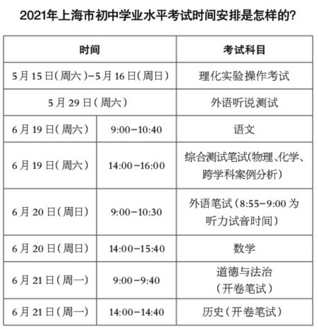 近日,上海市教育考试院发布2021年上海市初中学业水平考试的报名报考通知和问答,2021年上海新中考考试时间确定。记者对2021年上海市初中学业水平考试报名报考热点问题进行了汇总。 记者 朱筱丽 2021年上海市初中学业水平考试的报考对象是哪些? (1)本市初中八年级在籍在读学生。 (2)本市九年级在籍在读尚未取得本市中招报名和随迁子女报名资格的学生。学生在休学期间不得报考。 (3)已经取得2021年本市中等学校高中阶段招生(以下简称“中招报名”)资格和全日制普通中等职业学校自主招收初中应届毕业生中来沪人员随迁子女报名(以下简称“随迁子女报名”)资格并已完成报名的学生自动取得2021年上海市初中学业水平考试报考资格,无需重复报考和确认。 参加2021年上海市初中学业水平考试的考生可报考哪些科目? (1)本市初中九年级在籍在读学生报考科目为语文、数学、外语(含外语听说测试)、道德与法治(统一考试)、综合测试(含笔试和理化实验操作考试)。若未取得历史(统一考试)有效成绩(含缺考)的考生,由系统默认报考。 (2)本市初中八年级在籍在读学生报考科目为历史(统一考试)。 2021年上海市初中学业水平考试的报名报考如何进行? (1)尚未取得2021年中招报名资格和随迁子女报名资格的本市初中九年级在籍在读学生,由其学籍所在初中学校统一组织报名报考信息确认,时间为2021年3月12日(星期五)至3月16日(星期二)。 (2)本市初中八年级在籍在读学生,由其学籍所在初中学校统一组织网上集体报名,时间为2021年4月25日(星期日)至4月29日(星期四)。 (3)报名报考信息确认工作由各区统一组织实施。学校在完成所有考生网上报名工作后统一打印报名报考信息确认表,由考生本人和家长核对签字确认。信息确认工作的具体安排由各区、学校根据各自实际情况确定。报名报考信息一经签字确认不得修改。 2021年上海市初中学业水平考试历史科目统一开卷考试可以携带哪些材料? 历史(统一考试)采用开卷笔试的考试方式,允许考生携带《义务教育教科书(五·四学制)中国历史》第一、二、三、四册和《义务教育教科书(五·四学制)世界历史》第一、二册,教科书中不得夹带或粘贴任何材料。 2021年上海市初中学业水平考试道德与法治科目统一开卷考试可以携带哪些材料? 道德与法治(统一考试)采用开卷笔试的考试方式,允许考生携带《义务教育教科书(五·四学制)道德与法治》(八-九年级)教科书,教科书中不得夹带或粘贴任何材料。 2021年上海市初中学业水平考试的统一考试成绩有效性如何计算? (1)应届初中毕业生在八年级已取得历史(统一考试)有效成绩的不得重复报考,成绩至其毕(结)业当年有效。 (2)符合本市中招报名条件的往届生和返沪生所有统一考试的成绩仅当年有效。 2021年上海市初中学业水平考试的统一考试成绩何时公布? (1)2021年上海市初中学业水平考试的语文、数学、外语(含外语听说测试)、综合测试(含笔试和理化实验操作)、道德与法治(统一考试)成绩查询时间为7月19日。 (2)2021年上海市初中学业水平考试的历史(统一考试)成绩分两段开放查询。其中,八年级在籍在读考生历史(统一考试)成绩查询时间为7月23日。其余考生历史(统一考试)成绩与其初中学业水平考试其他科目成绩一起开放查询。 (3)考生可登录上海市教育考试院网站(www.shmeea.edu.cn)查询。