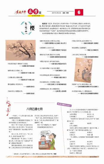 编者按:飞花令,原本是古人行酒令时的一个文字游戏,源自古人的诗词之趣,得名于唐代诗人韩翃《寒食》中的名句“春城无处不飞花”。行飞花令时可选用诗词曲中的句子,但选择的句子一般不超过七个字。《中国诗词大会》等诗词综艺栏目也引进并改良了“飞花令”,选手在规定时间内说出含有规定关键字的诗句即可。 本栏目每周会推出飞花令,帮助同学们积累古诗词佳句。 何处曾经同望月?樱桃树下后堂前。 ——白居易《感月悲逝者》 梅樱与桃杏,次第城上发。 ——白居易《花下对酒二首》 引手攀红樱,红樱落似霰。 ——白居易《花下对酒二首》 攀枝摘樱桃,带花移牡丹。 ——白居易《伤宅》 早梅结青实,残樱落红珠。 ——白居易《官舍》 绿蕙不香饶桂酒,红樱无色让花钿。 ——白居易《宴周皓大夫光福宅(座上作)》 红樱满眼日,白发半头时。 ——白居易《樱桃花下叹白发》 樱桃昨夜开如雪,鬓发今年白似霜。 ——白居易《感樱桃花因招饮客》 朱樱此日垂朱实,郭外谁家负郭田。 ——杜甫《惠义寺园送辛员外》 炎方每续朱樱献,玉座应悲白露团。 ——杜甫《解闷十二首》 何处哀筝随急管,樱花永巷垂杨岸。 ——李商隐《无题(其四)》 矜红掩素似多才,不待樱桃不逐梅。 ——杜牧《见穆三十宅中庭海榴花谢》 西蜀樱桃也自红,野人相赠满筠笼。 ——杜甫《野人送朱樱》 今朝社日停针线,起向朱樱树下行。 ——张籍《杂歌谣辞·吴楚歌》 果院新樱熟,花庭曙槿芳。 ——李峤《五月奉教作》 上林天禁里,芳树有红樱。 ——孙逖《和咏廨署有樱桃》 芙蓉阙下会千官,紫禁朱樱出上阑。 ——王维《敕赐百官樱桃(时为文部郎)》 未央朝谒正逶迤,天上樱桃锡此时。 ——崔兴宗《和王维敕赐百官樱桃》