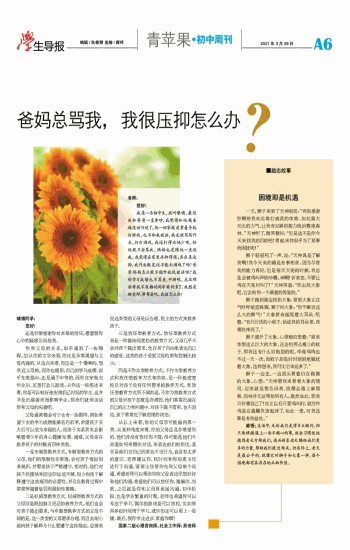 老师: 您好! 我是一名初中生,我叫啸啸。最近我和爸爸一直争吵,我觉得和他越来越没话可说了。他一回家就是拿着手机打游戏,也不和我说话,我也就写写作业,打打游戏,我还打得比他少呢。但他就只会骂我。妈妈也是跟他一直说我。我觉得在家里压抑得很,实在是没劲,我作业做完还不能打游戏了吗?爸爸妈妈怎么就不能听我说说话呢?我的学习成绩也不算差,中游吧,总比那些考试不及格的同学要好多了。我想求助老师,帮帮我吧,我该怎么办? 啸啸同学: 您好! 还是非常感谢你对本报的信任,愿意将你心中的疑惑告诉给我。 你和父母的关系,似乎遇到了一些障碍。但从你的文字来看,你还是非常渴望与父母沟通的,从这点来看,你还是一个懂事的,想亲近父母的。而你也提到,自己的学习成绩,似乎在班级中,还是属于中等的,而你在家做完作业后,还想打会儿游戏。从你这一些描述来看,你是可以较好地安排自己时间的学生,也并非是沉溺游戏而影响学业。那我们就来谈谈你和父母的沟通吧。 父母通常都会对子女有一些期待,例如希望子女的学习成绩能够名列前茅,希望孩子长大后可以成为幸福的人。而亲子关系其实会影响着青少年的身心健康发展。通常,父母亲在教养孩子的时候有四种类型。 一是专制型教养方式。专制型教养方式的父母,他们的限制性非常强,会对孩子强加很多规则,并要求孩子严格遵守。相对的,他们对孩子的接纳和回应则远远不够,很少向孩子解释遵守这些规则的必要性。并且在教育过程中常常伴随着惩罚和强制性策略。 二是权威型教养方式。权威型教养方式的父母则是既控制又灵活的教养方式。他们也会对孩子提出要求,与专制型教养方式的父母不同的是,这一类型的父母要求合理,而且会耐心地向孩子解释为什么要遵守这些规定。总得来说这类型的父母是以合理、民主的方式来教养孩子。 三是放任型教养方式。放任型教养方式则是一种接纳而宽松的教育方式。父母几乎不会对孩子提出要求,允许孩子自由地表达自己的感受。这类的孩子受到父母约束和控制比较少。 四是不作为型教养方式。不作为型教养方式和放任型教养方式相类似,是一种极度宽松且对孩子没有任何要求的教养方式。和放任型教育方式所不同的是,不作为型教养方式的父母对孩子态度是冷漠的,他们常常沉浸在自己的压力和问题中,对孩子既不管束,也不回应,孩子常常处于被忽视的状态。 从以上来看,你的父母亲可能偏向第一类。从某种角度来看,你的父母还是非常爱你的,他们并没有放任你不管,很可能是他们不知道如何来跟你对话,来表达他们的担忧。甚至是他们对自己的某些不当行为,也没有太多的意识。老师建议你,找时间和你的班主任进行下沟通,请班主任帮你先和父母做个沟通,希望老师可以帮助你向父母表达你想好好和他们沟通,希望他们可以信任你,理解你。当然,之后就是你和父母再坦诚沟通。初中阶段,也是学业繁重的时期,老师也希望你可以专注于学习,偶尔的游戏是可以放松,但如果再多些时间用于学习,或许你还可以更上一层楼。最后,祝你学业进步,家庭和顺! 国家二级心理咨询师、社会工作师:吴老师