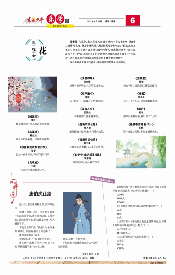 编者按:飞花令,原本是古人行酒令时的一个文字游戏,源自古人的诗词之趣,得名于唐代诗人韩翃《寒食》中的名句“春城无处不飞花”。行飞花令时可选用诗词曲中的句子,但选择的句子一般不超过七个字。《中国诗词大会》等诗词综艺栏目也引进并改良了“飞花令”,选手在规定时间内说出含有规定关键字的诗句即可。 本栏目每周会推出飞花令,帮助同学们积累古诗词佳句。 《赠汪伦》 李白 桃花潭水深千尺,不及汪伦送我情。 《苏溪亭》 戴叔伦 燕子不归春事晚,一汀烟雨杏花寒。 《白雪歌送武判官归京》 岑参 忽如一夜春风来,千树万树梨花开。 《鸟鸣涧》 王维 人闲桂花落,夜静春山空。 《江村即事》 司空曙 纵然一夜风吹去,只在芦花浅水边。 《临平道中》 道潜 五月临平山下路,藕花无数满汀洲。 《过故人庄》 孟浩然 待到重阳日,还来就菊花。 《宿新市徐公店》 杨万里 篱落疏疏一径深,树头花落未成阴。 《宿新市徐公店》 杨万里 儿童急走追黄蝶,飞入菜花无处寻。 《如梦令·常记溪亭日暮》 李清照 兴尽晚回舟,误入藕花深处。 《泊秦淮》 杜牧 商女不知亡国恨,隔江犹唱后庭花。 《寒菊》 郑思肖 花开不并百花丛,独立疏篱趣未穷。 《山行》 杜牧 停车坐爱枫林晚,霜叶红于二月花。 《惠崇春江晚景·其一》 苏轼 竹外桃花三两枝,春江水暖鸭先知。