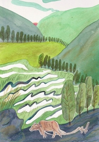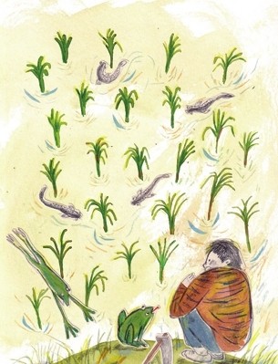作者:汤素兰 出版社:人民文学出版社 天天出版社 >>> 内容简介 大雨过后,男孩田犇家出现一串神秘的脚印,还未等他和妈妈探明究竟,更加惊奇的事接连发生:阳台上长满嫩绿的青草,卧室里芦笙长成了竹林,客厅里的红豆杉树墩和紫藤椅发出了新芽,外婆送他的脚板丘飞到了学校里……历经重重寻找和探查,原来这一切都由妈妈桌上那只复活的骨雕黄牛所引发—— 黄牛复活不仅是惊蛰到来,更是故乡云岭被野草捆缚的田土焦急悲切的呼唤;黄牛复活不仅为了不让梯田撂荒,更重要的是不让古老的农谚农活在当代孩子这里失传;黄牛复活还为孩子们带来一件件礼物,为的是让他们明白——如果相信奇迹,就会拥有奇迹;有些奇迹是幸运遇上的,有些奇迹需要自己去创造;但有梦想,总会有力量。 >>>内文节选 舅舅扛着犁,我牵着黄牛,我们一起往回走。 听到舅舅说要种家里的田,我想起了他跟妈妈说过的“脚板丘”。我看到翻耕过的田大多数像飘带一样长长的,面积至少都有半间教室大,没有哪一丘像脚板那样小,便问舅舅:“舅舅,哪一丘是脚板丘啊?” “你想找脚板丘啊,就在你脚下。”舅舅说。 我低头看我的脚下——是一个同我家阳台差不多大的小平台,傍着从梯田到外婆家去的小路,因为又高又密的杂草把田埂盖住了,不仔细看,根本看不出来这里原来也是一丘田。 “这丘田为什么不犁呢?” “这丘田太小了,没有办法犁。”舅舅说。 “那你们以前怎么插秧呢?” “以前像这样小的田,没有办法用牛犁,都是用锄头挖。”舅舅说。 “那我们也用锄头来挖吧。” “算啦,我们这冲梯田虽然犁过了,可你站到高处再看看,云岭上还有好多梯田,一冲一冲梯田都长了草撂荒了。这么脚板大一丘田,还要它做什么,就让它荒了算了。”舅舅说。 我为脚板丘打抱不平:“家里其他梯田都没有撂荒,只把脚板丘撂荒,这太不公平了。” “你觉得不公平,你来挖。”舅舅说。 “我来挖就我来挖。”我说。 我把黄牛送回牛圈,问外婆要了一把挖锄,来到脚板丘,开始挖田。 挖田比我想象的难多了:不用力吧,挖得很浅,每次只能挖起一小块泥土;用力挖下去吧,下面的泥很有黏性,挖锄深深嵌进泥里,像被吸住了似的,怎么拔也拔不出来。 舅舅、妈妈和外婆知道我不会使挖锄,更担心我挖了自己的脚,赶紧都跟了过来。舅舅一把夺过我的挖锄,自己跳进田里挖了起来。外婆看我想帮忙,给我一把像妈妈平时种花时用的花锄一样的小手锄,让我挖田埂上的草。 外婆还说:“三牛,你这么喜欢这个脚板丘,我把它送给你吧。” “好啊。那我要把杂草挖得干干净净,也要在脚板丘里插上秧苗。”我说。 “这主意倒不错。现在好多小孩子根本不知道我们吃的米是从哪里来的。你要真能种一丘田,了解从耕田、插秧到稻子成熟的过程,肯定很有收获。”妈妈说。 脚板丘虽然比脚板大了许多,但是确实是外婆家梯田中最小的一丘,一会儿工夫就被我和舅舅挖完了。舅舅又用钉耙把泥块耙碎,从田埂边的小溪里引来水,把田泡起来,让它从荒土变成水田。 为了把田弄平整,舅舅还脱了鞋袜跳进田里。 “哟,泥鳅钻脚板了!”舅舅放下手中的钉耙,弯下腰,双手往泥里去摸,果然捧出了一条好大的泥鳅。 “妈,你拿个盆子,我们抓些泥鳅晚上吃。”舅舅说。 “把它放了吧。”外婆说,“劝君莫食三月鲫,万千鱼仔在腹中。劝君莫打三春鸟,子在巢中待母归。你看它肚子那么大,肯定有一肚子卵。” 舅舅松开手,泥鳅跳回到水田里,它黑黑的身子扭几下,便消失在浑浊的泥水中了。 第二天一大早,我又来看脚板丘。 我刚走到田埂边,一只足有我拳头大的绿皮青蛙猛地蹦出来,跳到脚板丘中间,像个将军一样坐着,鼓起眼睛看着我,“呱呱”叫。 看它那神气的样子,简直像个镇守脚板丘的将军。 我便对青蛙说:“青蛙将军,我封你为脚板丘守卫!” 青蛙“呱呱”叫着,在脚板丘里蹦了几蹦,显得很高兴。 在早晨的太阳下,脚板丘像一块小镜子一样平整,闪闪发光。泡在水里的泥细细软软的,让我忍不住想摸摸。 我把手伸进泥里,水还有一点凉,但水下的泥暖暖的。 妈妈也来了,她告诉我,等天气再暖和一点,就可以把秧苗插在脚板丘里了。 我没有插过秧,也没有见过插秧,我问妈妈:“秧要怎么插呢?” 妈妈说:“插秧的时候,一般是左手拿着秧苗,右手分出两三根秧,用大拇指和食指捏着,向泥巴里直直地插下去。还有,插秧的时候是要退着走的,这你不知道吧?” “为什么要退着走呢?” 妈妈说:“秧刚刚插下去,还没有稳好蔸,如果你往前走,你会把秧苗踩翻,即便不踩到秧苗,踩着泥也会把秧挤得东倒西歪。所以最好是倒退着走,这样就不会损坏刚插下去的秧苗了。南朝有个布袋和尚,还从插秧当中悟出了生活的道理,写过一首《插秧诗》呢。” 接着,妈妈就念起南朝布袋和尚的《插秧诗》: 手捏青苗种福田, 低头便见水中天。 六根清净方成稻, 退步原来是向前。