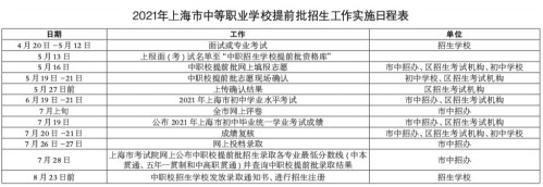 记者 朱筱丽 近日,《上海市教育委员会关于2021年本市中等学校高中阶段考试招生工作的若干意见》发布。市教委结合本市中职校工作实际,对本市开展中等职业教育—应用本科专业贯通培养模式试点、五年一贯制培养模式和中高职教育贯通培养模式试点工作提出相关要求。 招生计划:中等职业学校(以下简称“中职校”)提前批招生包括中等职业教育—应用本科专业贯通培养模式(以下简称“中本贯通”)、五年一贯制培养模式(以下简称“五年一贯制”)和中高职教育贯通培养模式(以下简称“中高职贯通”)、中职校自主招生(含航空服务、艺术类、自荐生)共三大类别。 报名条件:学生必须符合《上海市教育委员会关于做好2021年上海市中等学校高中阶段招生报名工作的通知》规定的报名条件,并通过本市中招网上报名信息确认和审核。以外籍身份报名且参加2021年本市中等学校高中阶段招生的学生不参加中职校提前批招生录取。报考中本贯通的学生必须是本市常住户籍应届初三学生(独立设置的艺体类中职学校试点专业除外)。 学校面(考)试:招生学校根据专业特点自主确定是否进行面试或专业考试。在做好疫情防控常态化的前提下,一般类专业原则上不组织线下面试(笔试),鼓励通过网络视频、网上递交作品等线上方式进行面试。采取线上面试的招生院校,要对软件平台的适用性、安全性、可靠性和稳定性等功能进行充分评估。确需组织线下面试的招生学校,要结合本单位情况对面试方案进行充分评估,提前制定面试工作流程、防疫措施和应急预案,尽量减少不必要的环节,防止人员聚集。同时,落实好各项防护措施,做好突发情况下的应急处置准备。线下面试方案须报上级主管部门疫情防控领导小组审核同意方可公布组织实施。 相关考试招生工作按照《2021年上海市中等职业学校提前批招生工作实施日程表》的要求开展。根据疫情防控形势,工作日程如有变动另行通知。相关招生方案报上海市教育考试院备案后,应及时向社会公布。 填报志愿:凡报考中职校提前批的学生,应在规定时间内登录“上海招考热线”网站(www.shmeea.edu.cn)填报志愿。三类志愿可同时兼报。中本贯通限报1个志愿,五年一贯制和中高职贯通可以填报3个志愿(五年一贯制专业和中高职贯通专业可以兼报),自主招生可以填报4个志愿(航空服务、艺术类和自荐生专业可以兼报)。 学生须根据自己的专业成绩及自身情况综合考虑,慎重选择学校及专业,学生填报的志愿代码将作为投档录取时的唯一依据。部分中职校专业有特殊要求的,报考学生需符合相关要求才能填报志愿,若因不符合招生要求而被学校退档的学生无法再被其他学校录取。 填报有面试或专业考试要求的学校志愿的学生,应是参加过相关招生学校组织的面试或专业考试,并进入“中职提前批资格库”的学生。否则不能填报相关志愿和投档录取。 未在规定的时间进行网上填报志愿的学生,视作自动放弃中职校提前批的招生录取。 志愿确认:中职校提前批志愿填报采取网上志愿填报和书面志愿现场确认相结合的方式进行,只有经书面志愿确认后才能参加市统一投档录取。 文化考试:填报中职校提前批志愿的学生,均须参加2021年上海市初中学业水平考试,并获得统一组织的闭卷考试科目的有效成绩。 录取工作:录取成绩包括语文、数学、外语、道德与法治、历史、综合测试(含物理、化学纸笔考试,地理和生命科学跨学科案例分析题,物理实验操作考试和化学实验操作考试)和体育与健身,以及与政策性照顾分数相加而成。中职校提前批录取按照先中本贯通录取,再五年一贯制和中高职贯通录取,最后自主招生录取的顺序依次进行。