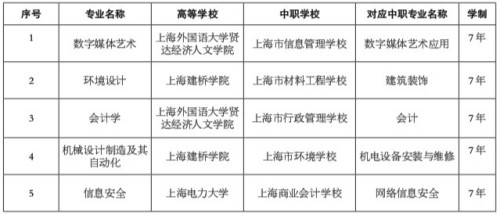 根据《上海市教育委员会关于开展中等职业教育—应用本科教育贯通培养模式试点工作的通知》,经学校申报、专家评议及市教委核定,2021年增设上海市信息管理学校与上海外国语大学贤达经济人文学院联合举办的数字媒体艺术等5个中职—应用本科教育贯通培养模式专业,相关高等学校在招生中须安排中等职业学校(含中专、职校和技校)毕业生招生计划。
