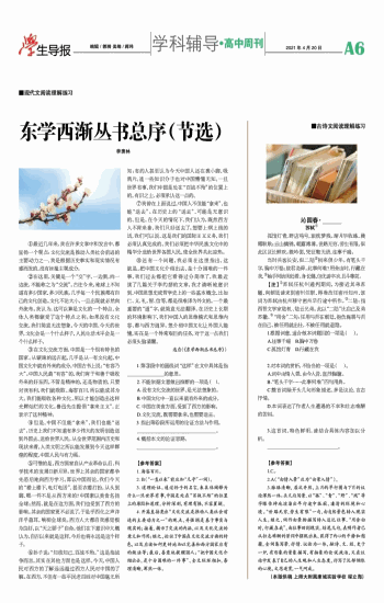 沁园春· 苏轼① 孤馆灯青,野店鸡号,旅枕梦残。渐月华收练,晨霜耿耿;云山摛锦,朝露溥溥。世路无穷,劳生有限,似此区区长鲜欢。微吟罢,凭征鞍无语,往事千端。 当时共客长安,似二陆②初来倶少年。有笔头千字,胸中万卷;致君尧舜,此事何难?用舍由时,行藏在我,③袖手何妨闲处看。身长健,但优游卒岁,且斗尊前。 【注】①苏轼任杭州通判期间,为接近其弟苏辙,向朝廷请求到密州任职,得准改任密州知州,该词为苏轼由杭州移守密州早行途中所作。②二陆:指西晋文学家陆机、陆云兄弟。此以“二陆”比自己及弟苏辙。③“用舍”二句:任用与否在朝廷,抱负施展与否在自己。被任用就出仕,不被任用就退隐。 1.根据词意,适合做本词题目的一项是()。 A.往事千端 B.胸中万卷 C.孤馆灯青 D.行藏在我 2.对本词的赏析,不恰当的一项是()。 A.词中由情入景,由今入昔,直抒胸臆。 B.“笔头千字……此事何难”四句用典。 C.整首词除开头几句形象描述,多是议论,言志抒情。 D.本词表达了作者人生遭遇的不幸和壮志难酬的苦闷。 3.这首词,特色鲜明,请结合具体内容加以分析。 _____________________________________________________。 【参考答案】1.C。 2.A(“由情入景”应为“由景入情”)。 3.脉络清晰,层次井然,上片的早行图与下片的议论浑然一体:头几句写景,以“孤”、“青”、“野”、“残”等字眼传神地渲染出早行途中孤寂、凄清的环境和心境。“世路无穷,劳生有限”一句,由自然景色转入现实人生。继之,词作由景物描写转入追忆往事。“用舍由时,行藏在我”,由往事回到现实。结尾几句,表明作者已从壮志难酬的苦闷中摆脱出来,获得了内心的平静和慰藉。全词集写景、抒情、议论为一体,融诗、文、经、史于一炉,有形象的景象描写,有抽象的论说政治,又在议论中发表了自己的人生观和人生态度,抒写了沉郁惆怅的心境,文思连贯,一气呵成。 (本版供稿 上师大附属康城实验学校 程立海)