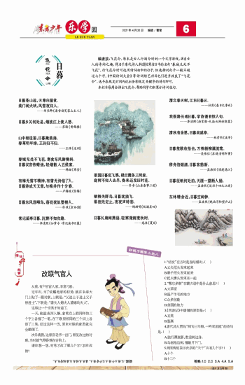 编者按:飞花令,原本是古人行酒令时的一个文字游戏,源自古人的诗词之趣,得名于唐代诗人韩翃《寒食》中的名句“春城无处不飞花”。行飞花令时可选用诗词曲中的句子,但选择的句子一般不超过七个字。《中国诗词大会》等诗词综艺栏目也引进并改良了“飞花令”,选手在规定时间内说出含有规定关键字的诗句即可。 本栏目每周会推出飞花令,帮助同学们积累古诗词佳句。 日暮苍山远,天寒白屋贫。 柴门闻犬吠,风雪夜归人。 ——刘长卿《逢雪宿芙蓉山主人》 日暮乡关何处是,烟波江上使人愁。 ——崔颢《黄鹤楼》 山中相送罢,日暮掩柴扉。 春草明年绿,王孙归不归。 ——王维《送别》 春城无处不飞花,寒食东风御柳斜。 日暮汉宫传蜡烛,轻烟散入五侯家。 ——韩翃《寒食》 有梅无雪不精神,有雪无诗俗了人。 日暮诗成天又雪,与梅并作十分春。 ——卢梅坡《雪梅》 日暮东风怨啼鸟,落花犹似堕楼人。 ——杜牧《金谷园》 常记溪亭日暮,沉醉不知归路。 ——李清照《如梦令·常记溪亭日暮》 梁园日暮乱飞鸦,极目萧条三两家。 庭树不知人去尽,春来还发旧时花。 ——岑参《山房春事二首》 栖栖失群鸟,日暮犹独飞。 徘徊无定止,夜夜声转悲。 ——陶渊明《饮酒其四》 日暮长廊闻燕语,轻寒微雨麦秋时。 ——寇准《夏日》 渭北春天树,江东日暮云。 ——杜甫《春日忆李白》 我报路长嗟日暮,学诗谩有惊人句。 ——李清照《渔家傲·天接云涛连晓雾》 清秋有余思,日暮尚溪亭。 ——林景熙《溪亭》 日暮笙歌收拾去,万株杨柳属流莺。 ——吴惟信《苏堤清明即事》 移舟泊烟渚,日暮客愁新。 ——孟浩然《宿建德江》 日暮征帆何处泊,天涯一望断人肠。 ——孟浩然《送杜十四之江南》 东林精舍近,日暮空闻钟。 ——孟浩然《晚泊浔阳望庐山》