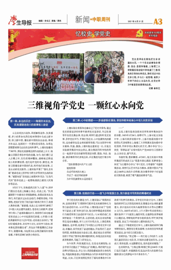 党史是革命先辈灿烂生命诗篇的合页,一个个党史故事饱含理想、信念、思想和情感。上海理工大学附属实验初级中学构建了三维视角来引导师生学党史,聆听党史中的生命之歌,并与之一起歌唱,滋养少年学子的红心永远向党,在党史学习中彰显思政教育的品质。 记者 余长江 第一维:身边的历史——烽烟并未远去,抗美援朝老战士的故事催人奋进 从长征到抗日战争,再到解放战争、抗美援朝,多少的革命先烈在枪林弹雨中为成立新中国、保卫新中国、建设新中国而浴血奋战。烽烟并未远去,祖国的下一代要有居安思危、如果祖国需要将策马出征的志向和勇气。上理实验建校于1957年,参加抗美援朝出国作战的战士左正、杨廉公回国后参加学校的创建,如今,他们都已迈入古稀之年,但仍然精神矍铄,清晰地记得战场上的拼搏场景。他们是听党的话、跟党走、保家卫国建设新中国的代表,聆听他们的故事,正是生动的党史教育。上理实验开展了“敬礼老英雄”邀请老战士到学校为师生讲雪夜伏击战的故事、“感恩有您”到老战士家慰问和采访、“红色代代传”陪伴老战士一起看杨浦滨江感悟人民情怀等活动。 5月3日下午,在杨浦滨江的“人人屋”中,同学们围坐在老战士杨廉公身边。老战士说,“抗美援朝那个时候有许多同胞牺牲。美国兵想来攻击我们,我们就反过去攻击他们,争着到前线,不怕牺牲,把他们打怕了他们就不敢再打我们了,美国人欺软怕硬。”紧接着,老战士还为同学们演唱了《中国人民志愿军战歌》,苍劲有力的歌声,把同学们带入了逍烟弥漫的岁月,使同学们深切地感受到老战士心中对祖国深沉的爱。七年级(1)班的周睿同学在日记中写到:老英雄告诉我们,“要好好锻炼身体,好好学习文化,好好学习政治,将来做祖国的建设者”,我也会不断提醒自己发奋学习,强健体魄,为祖国为社会做贡献而时刻准备着,不辜负前辈们的努力和信任。 第二维:心中的情感——赤诚感悟在涌动,原创诗歌和绘画心中话儿向党诉说 上理实验在班级和走廊设立了党史书香角,通过党史班级宣讲员和青年教师党史宣讲团、书记党课等开设党史晨会课、校会课,同学们通过聆听党史故事、自学党史书刊、开展红色走访,心中装满热忱的感悟。这些感悟也是宝贵的教育资源,可以在同学中相互感染、传递、激荡,上理实验注意到这一点,在复旦实验教育集团内发出倡议,联合集团四所学校的师生一起把学党史的感悟用原创诗歌、歌曲、书法、绘画、演讲稿等形式表现出来,并在集团内进行展示和分享。 “您执掌着名叫共产主义的 锐亮犁铧 在近乎冻死的大地上 开启了一场宏伟的春耕 为中华民族带来永远的春天 ……” 这是上理实验思创班的老师和同学集体创作的诗歌。2021年3月26日,春耕时节,上海市复旦实验中学、上海市同济初级中学、上海市杨浦初级中学的师生代表相聚在上海理工大学附属实验初级中学校园里,四所学校以集团化的方式,携手举办“红心向党 犁铧奋进”庆祝中国共产党100岁生日春耕诗会,以诗言志,意气风发。 书画传情,墨彩飘香。4月30日,复旦实验中学教育集团四所成员又以“笔墨书香沁满园 筑梦青春心向党”为主题举办学生“学习党史、分享感悟”书画联展活动。同学们以艺术作品为载体,讴歌中国共产党成立100年以来的丰功伟绩,饱含着莘莘学子对祖国的无限热爱,彰显了朝气蓬勃的青春气息。 第三维:创美的行动——放飞少年报国之志,努力奋进书写亮彩的青春时光 学习党史的关键是力行,上理实验以“报国的志向、创美的青春”引领同学们把学党史的感悟转化为努力奋进的行动。从3月开始,上理实验启动了“创美学习奋进之星”的争创行动,每位同学都追求创美的行为规范和努力奋进的学习状态。八(4)班的俞仁杰同学就是一个典型代表。以前的他,说实在话虽然聪明但是有些懒散,学习上时不时用点功,上课经常趴着睡觉。这学期,他参加了《中国江山》等党史学习活动,有触动,似乎找到了奋进的理由,开始用功了,进步很明显,班级推选他为奋进之星。最近他还在老师的指导下开始了数学拓展问题的探究,体现出良好的创新思维素养,写起了小研究论文。 当今世界,科技高度发达,但是也充满危险。社会学家贝克提出了“风险社会”的概念,将后现代社会诠释为风险社会,并认为人类面临着威胁其生存的风险,风险的制造者以风险牺牲品为代价来保护自己的利益。比如,贝克深刻洞见预言了福岛核事故中日本政府不负责任的做法。在学党史时政讨论中,上理实验的同学们认识到党的绿色发展理念对全球的重要意义,表示坚决反对向大海排放核污水等生态霸权主义行为。2021年4月22日,上午才期中考试结束的上理实验学子下午就到上海图书馆,应邀参加世界地球日主题活动,用嘹亮的声音为地球读诗,呼吁保护地球家园,表达了少年的美好心愿和浩然正气。 通过三个维度的党史学习,上理实验的同学们精神得到洗礼,理想信念更加清晰,生命的自信和热爱更加坚定,奋斗的马力更加强大。 有同学说:“我记得——我们是七月的孩子,从苗苗儿童团员到少先队员,时刻沐浴着党的阳光,立志成才,报效祖国,永远跟着党走,是我追求的理想。” 也有同学说,“白驹过隙/转眼已犁过100年/大地已是百花盛开、幸福满园/但是这次伟大的春耕仍在继续/因为它的梦是