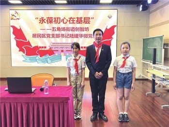 记者 曹莹 为喜迎中国共产党百年华诞,继承和发扬党的优良传统,引导学生争做践行社会主义核心价值观的“新时代好队员”,在“六一”儿童节到来前夕,五角场小学积极开展了丰富多彩的“童心向党迎华诞 争做新时代好队员”庆“六一”主题活动。日前,该校邀请到“2020上海市最美社乡社区工作者”、五角场街道创智坊居民区党支部书记陆建华为全体学生上了一堂别开生面的微党课《永葆初心在基层》。 陆书记为队员们带来了他准备的“五个一”:“一个感动的画面”、“一个难忘的经历”、“一场雨的故事”、“一场家园保卫战”、“一个温暖的家”等人生心路历程,向全体师生 生动诠释了他作为一名优秀共产党员是如何时刻不忘初心,牢记使命,多年来扎根在基层为民服务,为居民创造美好生活的。 陆书记以习总书记的话“青年兴则国家兴,青年强则国家强”来鼓励学生,希望他们能够从小就热爱党、热爱祖国,加倍努力,不断进步。