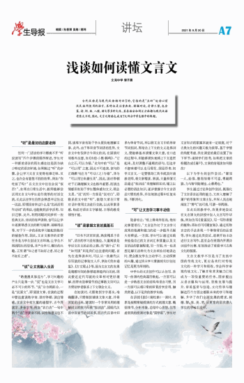 文来中学 郭子晨 古代汉语是与现代汉语相对而言的,它指的是“五四”运动以前汉民族所使用的语言。其特征是注重典故、骈骊对仗、音律工整,包含策、诗、词、曲、八股、骈文等多种文体。其在语法和词汇方面都与现代汉语有很大不同,因此,文言文阅读也成为了大部分中学生眼中的难题。 “听”是最好的启蒙老师 任何一门语言的学习都离不开“听说读写”四个步骤的循序渐进,学生对一种新的语言的陌生感往往是因为缺少特定的语言环境,如果跳过“听”的步骤,会让学习文言文变得枯燥乏味,反之,也许会有意想不到的效果。例如“你吃饭了吗?”在文言文中往往会说“饭否?”,如果在日常生活中,教师能够尝试用文言文与学生进行简单的对话交流,长此以往学生自然会熟悉并记住这一说法,即便没有学过什么是“名词活用作动词”的用法,也能做到活学活用、知识迁移。此外,利用闲暇时间多听一些经典文言、诗词的有声读物,也可以让学生逐渐熟悉文言的断句规律、省略用法等,对于下一步的系统学习能起到极好的铺垫作用。因此,文言文教学的首要任务是为学生创设文言环境,让学生不再因陌生而恐惧,并产生学习、模仿的兴趣。正所谓“知之者不如好之者,好之者不如乐之者”。 “说”让文言融入生活 “路漫漫其修远兮”,学习兴趣的产生只是第一步,“说”也是文言文学习必不可少的环节。“说”分为两部分,一是“说原文”,即诵读文章,在读的过程中要注意读准字音、读对停顿、读出情感。文言文中有大量的通假字、古今异读字、多音字等,例如“衣白衣”一句中两个“衣”字读音不同,词性和意义也不同,读准字音有助于学生更快地理解文章。此外,由于单双音节词语的差异,文言文中有很多古今异义的词,在诵读时须格外注意,如《诗经·小雅·鹤鸣》:“它山之石,可以为错。”此句中的“可以”是“可以用”之意,因此不可连读,该句的正确断句应为“可/以(之)为错”,译为“可以用它来磨玉英”。因此,读对停顿对于正确理解文义也格外重要。而读出情感则有助于学生整体感知文义、领会文思。“说”的另一方面是“说对白”,即联系前文中的“听”,鼓励大家在日常对话中使用文言进行交流,以此积累语感,构成对语言文字敏锐、丰厚的感受领悟才能。 “读”是掌握文言的奠基石 “旧书不厌百回读,熟读精思子自知”,语言的学习没有捷径,大量阅读是学好文言文的必经之路。而“读什么”和“如何读”则是我们应注意的问题。首先在选择读本时,可以从一些唐代以后写就的记事短文入手,例如《资治通鉴》、《古文观止》等,因为文言文的发展是随着时间的推移逐渐趋向白话的,因此接近近代写就的文章相对更好理解,而带有故事情节的记事散文则可以方便初学者联系上下文领会文义。 在初读时,无需做到字字落实,准确翻译,只需做到猜读文章大意,并将其复述出来。猜读时一个非常实用的理解词义的技巧叫做“组词法”,因现代汉语中双音节的词居多,而古代汉语中则多为单音节词,所以将文言文中的单音节词组词,再结合上下文的文义选择词义,便能够基本读懂文章大意,在口述的过程中,则能够更快地将上下文连贯起来,及时调整不通顺的语句。但这并不意味着可以走马观花、囫囵吞枣,初学文言文,一定要借助工具书或及时请教老师,将文章精读、熟读,大量积累无法通过“组词法”来理解的实词,辅之以必要的语法知识,逐步掌握古今文言语法习惯的差异,并在阅读过程中反复实践、不断消化。 “写”让文言学习事半功倍 陆游有云:“纸上得来终觉浅,绝知此事要躬行。”文言创作对于文言学习成果的检测和能力的进一步提升无疑大有裨益,一方面,学生可以通过实践来检验自己的文言词汇积累量以及文言语法的掌握程度,另一方面,当一些思想见解无法转化为文言来恰切地表达时,便会激发学生主动学习、主动探索的兴趣,通过自主学习掌握的知识往往记忆是更为深刻的。 中学生的文言创作可以从仿写、改写一些课内经典篇目做起,一方面可以进一步熟悉文言的结构和语言习惯,另一方面可以将日常的积累活学活用、触类旁通。以下是我的教学实践: 在讲授《狼》(蒲松龄)一课时,我原是按照常规授课的方式梳理文意、概括情节、分析形象、总结中心思想。但考虑到我的授课对象是“国学班”,学生对文言知识的掌握本就有一定深度,对于古典文化的兴趣又极为浓厚,基于学情 的角度考虑,我在课堂的最后设置了如下环节:请同学们思考,如果把文章的标题改成《屠户》,文章的结尾该如何修改? 以下为学生的创作尝试:“屠虽一人,始惧,继而悟得不可退,勇毙两狼。力与智非陡增也,止赖勇也。” 学生通过讨论和创作尝试,既强化了文言语言运用的能力,又深入理解了屠户的形象和文章主旨,并深入浅出地阐发了“勇气”的可贵,可谓一举两得。 在此后的教学中,我更多地尝试在文言课文的讲授中加入文言写作训练,例如仿写《爱莲说》,写一写你喜爱的植物;再如仿写《陋室铭》,通过托物言志的手法表现一个事物背后的品质等。学生通过此类尝试,逐渐开始主动进行文言写作,甚至会在班级内开展诗词创作比赛,有效推动了班级学习古典文化的氛围。 文言文教学不仅是为了发扬中国的传统文化,更应是我们对传统文化的一种学习和吸收