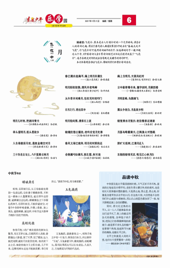 编者按:飞花令,原本是古人行酒令时的一个文字游戏,源自古人的诗词之趣,得名于唐代诗人韩翃《寒食》中的名句“春城无处不飞花”。行飞花令时可选用诗词曲中的句子,但选择的句子一般不超过七个字。《中国诗词大会》等诗词综艺栏目也引进并改良了“飞花令”,选手在规定时间内说出含有规定关键字的诗句即可。 本栏目每周会推出飞花令,帮助同学们积累古诗词佳句。 明月几时有,把酒问青天 ——《水调歌头•丙辰中秋》 宋•苏轼 举头望明月,低头思故乡 ——《静夜思》 唐•李白 人生得意须尽欢,莫使金樽空对月 ——《将进酒•君不见》 唐•李白 三十功名尘与土,八千里路云和月 ——《满江红•写怀》 宋•岳飞 春江潮水连海平,海上明月共潮生 ——《春江花月夜》 唐•张若虚 明月别枝惊鹊,清风半夜鸣蝉 ——《西江月•夜行黄沙道中》 宋•辛弃疾 从今若许闲乘月,拄杖无时夜叩门 ——《游山西村》 宋•陆游 日月之行,若出其中 ——《观沧海》 东汉•曹操 明月松间照,清泉石上流 ——《山居秋暝》 唐•王维 晓镜但愁云鬓改,夜吟应觉月光寒 ——《无题•相见时难别亦难》 唐•李商隐 春风又绿江南岸,明月何时照我还 ——《泊船瓜洲》 宋•王安石 会挽雕弓如满月,西北望,射天狼 ——《江城子•密州出猎》 宋•苏轼 海上生明月,天涯共此时 ——《望月怀远/望月怀古》 唐•张九龄 云中谁寄锦书来,雁字回时,月满西楼 ——《一剪梅•红藕香残玉簟秋》 宋•李清照 月明星稀,乌鹊南飞 ——《短歌行》 东汉•曹操 露从今夜白,月是故乡明 ——《月夜忆舍弟》 唐•杜甫 烟笼寒水月笼沙,夜泊秦淮近酒家 ——《泊秦淮》 唐•杜牧 月落乌啼霜满天,江枫渔火对愁眠 ——《枫桥夜泊/夜泊枫江》 唐•张继 野旷天低树,江清月近人 ——《宿建德江》 唐•孟浩然 东船西舫悄无言,唯见江心秋月白 ——《琵琶行/琵琶引》 唐•白居易