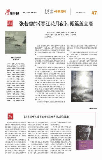 《春江花月夜》 唐·张若虚 春江潮水连海平,海上明月共潮生。 滟滟随波千万里,何处春江无月明! 江流宛转绕芳甸,月照花林皆似霰。 空里流霜不觉飞,汀上白沙看不见。 江天一色无纤尘,皎皎空中孤月轮。 江畔何人初见月?江月何年初照人? 人生代代无穷已,江月年年望相似。 不知江月待何人,但见长江送流水。 白云一片去悠悠,青枫浦上不胜愁。 谁家今夜扁舟子?何处相思明月楼? 可怜楼上月徘徊,应照离人妆镜台。 玉户帘中卷不去,捣衣砧上拂还来。 此时相望不相闻,愿逐月华流照君。 鸿雁长飞光不度,鱼龙潜跃水成文。 昨夜闲潭梦落花,可怜春半不还家。 江水流春去欲尽,江潭落月复西斜。 斜月沉沉藏海雾,碣石潇湘无限路。 不知乘月几人归,落月摇情满江树。 张若虚,扬州人,生平不详,与贺知章、张旭、包融并称“吴中四士”,其诗仅存两首,其中一篇《春江花月夜》素有“孤篇盖全唐”之誉。 这是一首宫体诗,被闻一多先生誉为“诗中的诗,顶峰上的顶峰”,“一孤篇,压过全唐”。春江花月夜为乐府旧题,相传始于南朝陈后主,但本诗除了曲调名沿用旧体外,内容与风格都与以前供宫廷娱乐的歌曲大异其趣。 在一个月光皎洁的晴澈夜晚,诗人临于春江边,看着浩瀚无垠的江潮及月光下那片澄澈无际的世界,牵动起无限情思。诗人讴歌优美的自然,赞颂纯洁的爱情,将诗情画意与哲理熔于一炉,营造出一片幽深渺远的意境。 开篇写景,勾勒出一幅春江花月夜的壮丽画面。诗人把“月华”作为主体,作为情感的纽带,从“明月共潮生”写到“落月摇情满江树”,以月的运行来布局,展现了一个完整的心路历程。在月光的照耀下,哪一处春江不反射着明月的光辉呢。诗人神思飞跃,在写景的同时又在探索着宇宙和人生的奥秘,个体的生命虽然短暂有限,但人类的存在却同那日日升起在江上的明月一样,绵延不息。紧接着,诗人便向我们展现出一幅具体的人生图景,一幅思妇游子的人生图景,引入爱情这一飘荡在人世间永恒的旋律,将景与情巧妙相连,引人入胜!春、江、花、月、夜这五种艺术形象集中体现了人生最动人的良辰美景,构成了诱人探寻的奇妙的艺术境界。 无论你是第一次读这首《春江花月夜》,还是读了很多遍,都会发现,这首诗只有一个字,就是——“美”。这个美不仅体现在用词方面,还体现在其独有的意境上面。 古代诗词讲究“意境”。《春江花月夜》中的意境,就是美不胜收,而且这种美不是一种普通的视觉审美,而是营造出了一种空灵优美的意境,属于更高层次的精神审美。 然后,这首诗非常具有哲理性与思想性。在诗中写道:“人生代代无穷已,江月年年望相似。不知江月待何人,但见长江送流水。” 时间是永恒的,明月是永恒的,而人生是短暂的。 总之,在这首诗中,张若虚将一轮明月写得美轮美奂,写得凄美多情,而且更为难得的是,他还将音律、诗词、思想以及情感融合得这样完美,因此,才有“孤篇盖全唐”如此之高的评价。