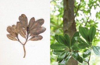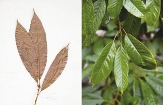 这是10月10日在昆明植物园拍摄的西畴青冈。这张拼版照片分别为科研人员野外采集的标本(左)和在植物园迁地保护后存活下来的同种植物。