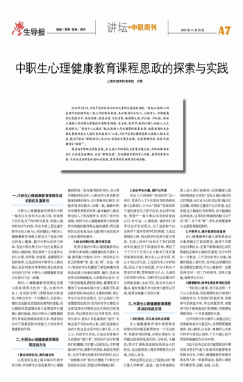 上海市城市科技学校 方莉 2018年5月2日,习近平总书记在与北京大学师生座谈时指出:“要把立德树人的成效作为检验学校一切工作的根本标准,真正做到以文化人、以德育人,不断提高学生思想水平、政治觉悟、道德品质、文化素养,做到明大德、守公德、严私德。要把立德树人内化到大学建设和管理各领域、各方面、各环节,做到以树人为核心,以立德为根本。”党的十八大提出“把立德树人作为教育的根本任务,培养德智体美全面发展的社会主义建设者和接班人”以来,习近平总书记围绕坚持立德树人根本任务,提出了诸如“理想指引人生方向,信念决定事业成败。没有理想信念,就会导致精神上‘缺钙’”。 笔者在中等职业学校任教,本文就以中职学校为背景开展讨论。中职的课程体系中,无论是思政课程,还是“课程思政”,均发挥着重要的育人功能。教育的重要任务,不仅仅是向学生传授知识技能,更重要的是培养学生的品格。 一、中职生心理健康教育课程思政的目的及重要性 中职生心理健康教育课程与中职一般的文化课和专业课不同,该课程不仅仅是为了向中职生普及、传授心理学的知识与内容,其在本质上更注重中职学生的人格与心灵的健全,中职生心理健康教育课程主要是为了促进中职生的身心健康、提升中职生的学习效率、促进中职生智力与个性化发展以及预防心理疾病。思政教育十分注重学生的人生观、世界观、价值观、道德观等方面的培养,但是没有对中职学生人格发展以及如何面对青春期自身出现的变化而进行引导,中职生心理健康教育就正好弥补了这一缺憾。 同时,心理健康教育课程也有着与思政课程共性的一面。在教学内容上,有些部分两门课程是相互渗透的。中职生作为一个完整的人,良好的心理状态是接受思想政治教育的前提,而正确的思想道德品质又是塑造学生健康心理的基础。因此中职生心理健康教育与思政是相辅相成的关系,两者的结合对于高素质技术技能人才的培养有着重要的作用。 二、中职生心理健康教育课程思政的方法 1.整合师资队伍,提升融合性 以笔者所在的上海市城市科技学校为例,学校将专业思政教师与心理健康教师统一放在德育教研组中。在日常开展教研活动中,心理老师与思政教师能保持同步而行;在日常教学过程中,则能实现相互配合、协调一致。随着中职学校德育课程的改革,越来越多心理老师也加入了思政教育中,承担了部分的课程。相信今后心理健康教育与思政教育双肩挑的教师将会越来越多。两支教师队伍的有机结合也能更好地实现学生综合素养的提升。 2.结合时事内容,提升现实感 笔者任教的中职心理健康教育以《中职生青春期心理健康自助手册》(主编 颜苏勤)为教材,其中一课讲到认知自己的情绪“喜、怒、哀、惧”。在这一课中,笔者给学生们播放了新冠病毒对身体造成极大伤害的视频。随后,笔者询问学生的情绪感受。大多数学生表示,对于新冠病毒是感到恐惧的。接着笔者又播放了在2020年除夕夜上海医疗队派出医护团队奔赴武汉支援的视频。再让学生讨论并发表观点,为什么医护工作者愿意前往武汉?因为所有学生都经历过新冠肺炎时期的全民共同抗击疫情阶段,所以课堂的讨论非常热烈。有的学生表示,医务人员是最美的“逆行”英雄,也是平凡的血肉之躯。他们是拯救生命的天使,也是生活中的人妻人母、人夫人父。有的学生则说,正是这些普通平凡的最美“逆行者”,用实际行动守护着我们的健康,守护着人民的安全,守护着城市的平安,感谢平民英雄,感谢党和国家。在这节课完成教学任务的同时,还以“润物细无声”的方式增强了中职生对党的政治认同、思想认同和情感认同。 3.结合学生兴趣,提升认可度 在这几天讲授的“悦纳自我”这一课中,笔者引入了今年国庆档的热映电影《长津湖》,片中由“顶流”明星易烊千玺扮演的伍万里不自信,初出茅庐的他,想要干一番大事业来寻求哥哥的认可。针对这一心理现象,请同学们思考讨论并发表观点。由于这部影片以及易烊千玺深受同学们的喜爱,又是近期刚刚上映,因此同学们的参与度非常高。在课上同学们也表示了我们的国家和民族经历了深重的苦难,牺牲了千千万万个优秀儿女才换来了现在繁荣富强的局面。因为有人以身许国,所以才有山河无恙,正是因为有人守护团圆,因此才有万家团圆。作为中职生不要妄自菲薄,要积极面对人生,认清自己的优势与特长,为新时代社会建设作出积极贡献。由此可见,结合学生的兴趣点,能有效提升学生的参与度和认可度,能更好地融入思政元素。 三、中职生心理健康教育课程思政的实践反思 1.与时俱进,关注身边热点话题 在心理健康教育课中将课程思政做好的前提是教师拥有一个关注世界、热爱思考的灵魂。如果在课堂中,老师提出的案例是陈旧的、乏味的、无趣的,那对于课程思政的效果将会大打折扣。这也就要求心理老师需要关注时事,并深入思考。 例如近期在社会上引起热议的“莆田重大刑事案”,就是一起非常值得在课上深入探讨的案例。犯罪嫌疑人欧某的情绪是怎样的?没有正确处理好自己的情绪,会引发什么样的后果?随后引出话题,即使自己遭受不公正待遇,也应该通过正确途径寻求帮助,决不能触犯法律底线。这样的时事案例的魅力在于其“真”、在于其“