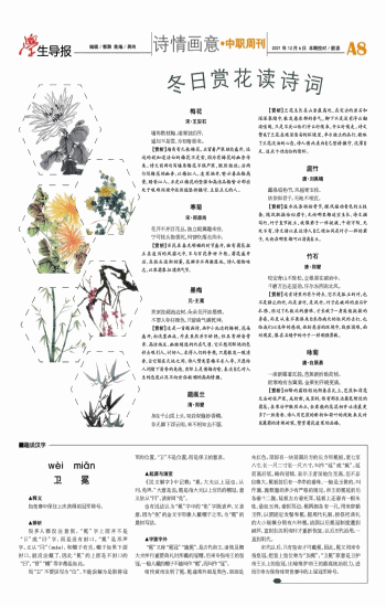 梅花 宋·王安石 墙角数枝梅,凌寒独自开。 遥知不是雪,为有暗香来。 【赏析】墙角有几枝梅花,正冒着严寒独自盛开。远远的就知道洁白的梅花不是雪,因为有梅花的幽香传来。诗文前两句写墙角梅花不惧严寒,傲然独放;后两句写梅花的幽香,以梅拟人,凌寒独开,喻示着品格高贵,暗香沁人。亦是以梅花的坚强和高洁品格喻示那些处于艰难环境中依然能坚持操守、主张正义的人。 寒菊 宋·郑思肖 花开不并百花丛,独立疏篱趣未穷。 宁可枝头抱香死,何曾吹落北风中。 【赏析】百花在春光明媚的时节盛开,独有菊花挺立在凌厉的风霜之中,不与百花争妍斗艳。菊花盛开后,在枝头逐渐枯萎,花瓣并不凋谢落地。诗人借物咏志,以寒菊象征凛然气节。 墨梅 元·王冕 我家洗砚池边树,朵朵花开淡墨痕。 不要人夸好颜色,只留清气满乾坤。 【赏析】这是一首题画诗。画中小池边的梅树,花朵盛开,由淡墨画成,外表虽然并不娇艳,但具有神清骨秀、高洁端庄、幽独超逸的内在气质。它不想用鲜艳的色彩去吸引人,讨好人,求得人们的夸奖,只愿散发一股清香,让它留在天地之间。诗人赞美墨梅不求人夸,只愿给人间留下清香的美德,实际上是借梅自喻,表达自己对人生的态度以及不向世俗献媚的高尚情操。 题画兰 清·郑燮 身在千山顶上头,突岩深缝妙香稠。 非无脚下浮云闹,来不相知去不留。 【赏析】兰花生长在山岩最高处,在突出的岩石和深深裂缝中,散发着浓郁的香气。脚下不是没有浮云翻滚喧闹,只是不关心他们什么时候来,什么时候走。诗文赞美了兰花在艰苦恶劣的环境里,卓尔独立的品行,歌咏了兰花淡泊的心态,诗人借此表白自己坚持操守、淡薄自足、追求个性自由的情怀。 庭竹 唐·刘禹锡 露涤铅粉节,风摇青玉枝。 依依似君子,无地不相宜。 【赏析】露水洗涤铅粉骨节,微风摇动青色的玉枝条。随风飘摇恰似君子,无论哪里都适宜生长。诗文描写竹,竹子直节挺立,就像君子一样挺拔,千村万陌,无处不有。诗文借以表达诗人自己便如同是竹子一样的君子,无论在哪里都可以清高自立。 竹石 清·郑燮 咬定青山不放松,立根原在破岩中。 千磨万击还坚劲,任尔东西南北风。 【赏析】这首诗里竹有个特点,它不是孤立的竹,也不是静止的竹,而是岩竹,是风竹。竹子在破碎的岩石中扎根,经过了无数次的磨难,才长就了一身英俊挺拔的身姿,而且从来不畏惧来自东西南北的狂风的击打,也给我们以生命的感动,曲折恶劣的环境中,战胜困难,面对现实,像在石缝中的竹子一样刚强勇敢。 咏菊 唐·白居易 一夜新霜著瓦轻,芭蕉新折败荷倾。 耐寒唯有东篱菊,金粟初开晓更清。 【赏析】初降的霜轻轻地附着在瓦上,芭蕉和荷花无法耐住严寒,或折断,或歪斜,惟有那东边篱笆附近的菊花,在寒冷中傲然而立,金粟般的花蕊初开让清晨更多了一丝清香。诗人用芭蕉的新折和荷叶的残败来反衬东篱菊的清绝耐寒,赞赏菊花凌寒的品格。