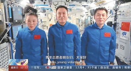 第36个国际志愿者日来临之际,正在执行飞行任务的神舟十三号飞行乘组在中国空间站,以视频方式,向广大青年志愿者致以节日祝福。 航天员翟志刚、王亚平和叶光富先后表达了他们对青年志愿者的祝福和希望。他们为青年志愿者在疫情防控、脱贫攻坚、乡村振兴、社区发展、应急救援等方面做出的成绩点赞,寄语青年志愿者继续弘扬“奉献、友爱、互助、进步”的志愿精神,做知行合一的奋斗者,坚持与祖国同行、为人民奉献,以青春梦想、用实际行动,为实现中国梦作出新的更大贡献。 这是中国青年志愿者第二次收到来自太空的珍贵礼物,是载人航天精神与志愿精神的又一次对话。2016年,由全国各地青年志愿者参与绣制的中国青年志愿者“飞天旗帜”搭乘天宫二号空间实验室飞向太空,成为全世界第一面遨游太空的志愿者旗帜。航天员景海鹏、陈冬在天宫二号空间实验室展示青年志愿者旗帜的画面,成为亿万志愿者共同的美好记忆,激励着他们学习航天精神,勇做志愿先锋。 载人航天事业的成就,充分展示了伟大的中国道路、中国精神、中国力量。载人航天精神是纳入中国共产党人精神谱系的伟大精神。此次来自太空的节日祝福,传递着“特别能吃苦、特别能战斗、特别能攻关、特别能奉献”的精神内涵,必将激励广大青年志愿者奋力弘扬“奉献、友爱、互助、进步”的志愿精神,在新征程中续写壮丽的新时代青年志愿者之歌。 (来源:中国青年网)