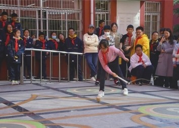 记者 朱筱丽 这个学期,抽陀螺、飞镖、滚铁圈等9个传统体育游戏走进了上海市金杨中学的校园,这些游戏深受同学们的喜爱。据了解,学校为了保证“大课间30分钟”活动“人人能参与,人人有去处”,在充分利用已有资源如乒乓球、羽毛球、篮球等活动项目和场地外,还以“项目化学习”方式,在同学中征集方案,充分利用校园空地,开发新的项目和场地。本学期引入传统体育游戏,共开发出9个项目场地,让校园成为学生的运动乐园。 为了让同学们的参与感更强,学校制定各项传统体育游戏等活动规则,并将活动规则上墙,指导同学们开展各种活动。不仅如此,学校还举行了“金球杯”羽毛球、篮球比赛,“金绳杯”长短绳比赛,“陀螺比赛”“滚铁圈比赛”“踢毽子”和“毽球”比赛等竞赛活动,通过竞赛推广活动项目,使得运动项目得以普及化。 为了保证项目的有序开展,保证人人都要动起来,学校还实行活动打卡制,规定每个项目每学期打卡的次数,每个点位的每日限流人数,以此来促进活动的有序开展。学校加强活动项目的管理,每天每个点位都安排教师专人负责,做到“四责”即“负责器材收发、负责活动安全、负责活动指导、负责活动打卡”。
