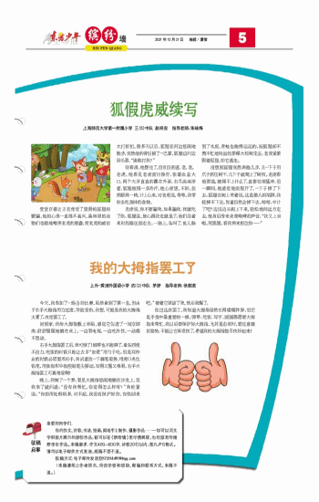 上海师范大学第一附属小学 三(5)中队 赵梓安 指导老师:朱咏梅 堂堂百兽之王老虎受了狡猾的狐狸的蒙骗,他的心里一直很不高兴,森林里的动物们也暗地嘲笑老虎的愚蠢,使老虎的威信大打折扣。很多天以后,狐狸在河边悠闲地散步,突然他的背后挨了一巴掌,狐狸边问边回头看,“谁敢打我?” 待看清,他愣住了,自言自语道,老,老,老虎。他看见老虎面目狰狞,张着血盆大口,两个大牙直直的露在外面,右爪高高举着,狐狸惊得一身冷汗。他心里想,不好,忽然眼珠一转,计上心来,对老虎说,等等,我带你去吃美味的食物。 老虎说,你不要骗我,如果骗我,我就吃了你。狐狸说,放心跟我走就是了。他们沿着来时的路往回走去。一路上,鸟叫了,鱼儿躲到了水底,青蛙也跑得远远的,而狐狸却不慌不忙地向远处那棵大松树走去。老虎紧紧跟着狐狸,怕它逃走。 没想到狐狸突然奔跑几步,又一下子用爪子抓住树干,几下子就爬上了树枝。老虎看他要逃,就顾不上什么了,直接往前猛冲,但一瞬间,他感觉地面裂开了,一下子掉了下去。狐狸在树上笑着说,这是猎人的陷阱,我轻掉不下去,你重自然会掉下去。哈哈,中计了吧?边说边从树上下来,轻松地向远方走去,他身后传来老虎咆哮的声音,“我又上当啦,死狐狸,看我将来抓住你……”