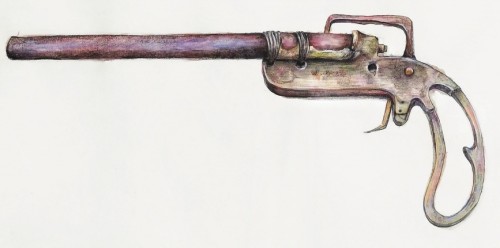 作者用钢笔淡彩的手法表现这把令人肃然起敬的土枪。
