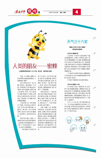 上海新黄浦实验学校 五(4)中队 裴文韬 指导老师:陈艳 我是一只可爱的小蜜蜂。我们和养蜂人既是亲密的朋友,又是默契的“搭档”。 我们共同生活在一起,养蜂人带我们一路追逐每一个花期。不同的季节,我们都会追不同的花。春天追迎春、油菜花,夏天追茉莉、荷花,秋天追菊花、芙蓉,等到冬天,养蜂人会带我们去云南花田过冬。我们为花而生,为花而死。为了感谢,我们回馈他们蜂蜜。 可是好景不长,我们被困在了原地,无法到达云南花田过冬,我们无法采集花蜜,大量死亡。剩下的一点小伙伴靠养蜂人高价买来的白砂糖度日。直到那天,连他也再没出现…… 我们开始了逃亡。逃到一片森林里,锯木头的声音吵得我们头脑发胀,树木都接连倒下,只剩下了光秃秃的树干。没办法,我们只好继续逃亡。 我们逃到了农田里,看到了许多花。长时间呆在巢里,我们早已饥渴难耐。同伴们和我都去采集花蜜。突然,我眼前一黑,脚下一滑,摔在了地上。原来,农民为了防止害虫啃咬庄稼,大量喷洒农药。这时,我做了一个奇怪的梦: 梦见我来到了一个陌生的地方,树木茂盛,鲜花盛开,它们指引着我去采蜜。我不停地采啊采,造成了我的六边形巢。接着,我开始繁殖后代,生儿育女,最终成为了一个庞大的家族,而我,成为了蜂王。 忽然,我醒了。哎,梦想真的很美好,但是现实却非常残酷:内蒙古草原大量捕猎鹰、蛇,导致田鼠泛滥成灾;大量塑料投入海洋,最后通过食物链进入自己体内……人类啊,这些事还少吗?最后吃到苦头的是你们自己!爱因斯坦说过,“蜜蜂消失后,人类只能活四年。”所以,我们应该永远成为人类的朋友。