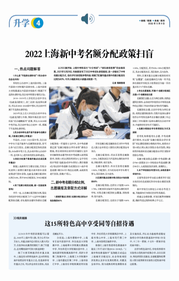 从2022届开始,上海中考将实行“计分科目”+“招生录取政策”的全面改革。2021年12月29日,市教委发布了2022中考招生录取细则,进一步细化了中考名额分配方式、综合评价录取程序等内容,明确了区属市重点高中名额分配招生比例为60%。今天小编就来给大家重点梳理一下。 记者 郭漪 整理 一、热点问题解答 1.什么是“不选择生源学校”?民办初中包含在内吗? 所有的公办初中(上海实验学校、上海外国语大学附属外国语学校、上海外国语大学附属浦东外国语学校除外)都属于不选择生源学校;民办初中则要分情况讨论: 2018-2019年入学的民办初中学生(也就是目前初三、初二在读)是选择生源的,所以在2022-2023届中考时,民办初中不属于不选择生源学校; 2020年及之后入学的民办初中学生(也就是目前七年级、预初年级在读)实行的是“民办超额摇号”政策,所以从2024届中考开始,民办初中和公办初中一样,都属于不选择生源学校。 2.民办初中学生是不是不能参与名额分配,只能通过裸考上市重点? 不是的。2022-2023届中考,民办初中学生只是不能参与名额到校录取,但可以参与自主招生、名额分配到区和统招录取;2024届中考之后,民办初中和公办初中一样,也可参与上述所有的招生录取途径。 3.四校分校属于委属市重点还是区属市重点? 根据上海教育官方微信回复,四校分校原则上按照区属市重点高中招生录取政策进行招生录取,也就是名额分配招生比例占60%,其中30%分配到区,70%分配到校。 4.有了名额分配的名额,就一定能被录取吗? 并不一定。以名额分配到校为例,假设你的初中学校分配到了2个七宝中学名额分配到校名额,首先填报志愿时你要在名额分配到校一栏填报七宝中学,且中考成绩要达到“名额分配综合评价录取”最低分数线,然后将你所在初中所有填报七宝中学名额到校志愿考生的中考成绩从高到低排序,按照1:2的比例投档参加七宝中学的综合考查(也就是4名学生参加);最后根据4位考生的中考成绩(含政策加分)+高中考查成绩(满分50分)得出总成绩,由高到低进行录取,录满2个即止。 二、新中考名额分配比例、志愿填报及录取方式详解 1.委属市重点(四校)名额分配占招生计划总数的65% 所有名额分配名额按各区当年中考报名人数占全市报名人数的比例分配到全市各区: 名额分配到校:所在区获得名额数×20%,分配到该区内不选择生源的初中学校,同校排序,校区竞争。 名额分配到区:所在区获得名额数×80%,分配到区,区内的各初中学生都可参与,同区排序,区内竞争。 2.区属市重点名额分配占招生计划总数的60% 名额分配到校:总招生计划数×60% ×70%,分配到本区每所不选择生源的初中学校,实现名额分配到校全覆盖,同校排序,校内竞争。 名额分配到区:总招生计划数×60% ×30%,分配到区,其中90%~95%分配到外区,其余分配到本区,同区排序,区内竞争。 同时,区属市重点名额分配到校将实现“全覆盖”,也就是确保区内每一所不选择生源初中学校至少获得该区内每一所市重点至少1个招生名额。 3.考生志愿填报,可填1个名额分配到区志愿+1个名额到校志愿 名额到区志愿:以区为单位录取,相同志愿同区排序;全体初中学校符合中考报名条件的应届初三毕业生和社会考生均可填报; 名额到校志愿:以初中学校为单位录取,相同志愿同校排序;仅限不选择生源学校符合中考报名条件且在籍在读满三年应届初三学生填报(选择生源的民办初中学生、中途转学的学生不可填报)。 4.名额分配综合评价录取招生方式及流程 招考机构根据考生志愿、中考成绩进行排序,对达到“名额分配综合评价录取”相应最低控制分数线的考生,按招生计划1:2的比例从高分到低分依次投档,参加报考学校组织的名额分配综合评价录取学校综合考查。 名额分配录取总成绩=中考成绩(满分750+政策加分)+学校综合考查成绩(满分50分),从高到底依次录取,录满即止。 5.关于学校综合考查50分,由相应高中学校打分: 主要考查初中学生综合素质评价《纪实报告》的完成情况和学生综合素质发展情况; 高中学校自主制定公示综合考查方案,不能组织任何形式的学科类测试; 将通过全程录像、双盲匹配等保障制度,确保考查过程和结果公平公正。
