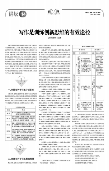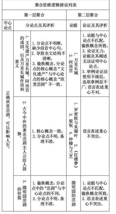 上海市向明中学 肖友清 创新思维是指思维的最高境界创造性思维。它凌驾在不同类型的思维之上。思维,根据分类标准的不同,可以分成不同的种类。从思维发展水平来看,可分为感知动作、具体形象、抽象逻辑三类;从思维的指向性来看,可以分为聚合思维、发散思维;从思维的步骤来看,可分直觉思维和分析思维;依据日常经验来分,可以分为经验思维与理论思维;从创造的角度,又可分为再造性思维和创造性思维。而最高境界的创造性思维涵盖了如下四个思维层面:发现问题,形成主见;融会贯通,超越自我;以简御繁,运用自如;览众山小,通透睿智。写作中,作者从发现问题到解决问题,再到形诸成文的整个过程,就是一个创造性过程。在这过程中,可能在不同的阶段会运用到不同的思维,最终,从无到有,产生出一篇富有创见的佳作。 一、审题有利于训练分析思维 分析思维,是指经过仔细研究、逐步分析,最后得出明确结论的思维方式,包括归纳推理、演绎推理、证明等逻辑思维,它是衡量一个人阅读能力高下的标准。写作,尤其是材料作文,审题是对学生阅读能力的考查,而阅读能力的高下主要是取决于分析思维。分析思维有如下五个层次: 二、立意有利于训练聚合思维 聚合思维,是指从已知信息中产生逻辑结论,从现成资料中寻求正确答案的一种有方向、有条理的思维方式,又称求同思维、辐合思维法。 立意,在写作中,就是指作品主题的确立,即认真审题,确立论题后,就要多角度多层次阐述自己的观点。立意,不仅限于主旨,它包括全文的思想内容,作者的构思设想和写作意图及动机等,在议论文中,它包括文章的中心论点和其他的基本观点。 聚合思维在立意时的使用主要表现在如下两个方面:一是指使文章中的若干个基本观点,多角度、多层次地指向文章的中心主题;二是收集生活中或阅读中积累的多种不一样的素材,从不同角度、多层次地来表现文章中的某一基本观点。以议论文为例,一则是分论点要从不同角度去论证同一个中心论点;二则是收集不同的论据,用不同的方法论证某一个分论点。 在这两方面的聚合思维过程中,学生的逻辑错误非常普遍。在第一方面,经常出现论证角度重合或杂糅的现象,而导致论证不充分或条理不清晰的问题;在第二方面,经常会出现论据与分论点的不匹配、论证方法使用不规范和语言表述不当等问题;举例如下: 在漫长的历史进程中,悲剧是在所难免的,只有正确去面对,懂得欣赏,悲剧或许对我们的生活产生深远的影响。 举世无双的世界文化遗产之一,耸立在中华大地上的万里长城,是由千千万万堆白骨筑积而成,为了它,有多少人妻离子散,惨死于长城脚下。有了它,匈奴才被拒之长城以北;有了它,才有了孟姜女哭长城的佳话;有了它,才有至今仍令人流连忘返的绝佳美景;有了它,才使中国腾飞的经济有了一大支柱。建长城的历史背景是凄惨的,但是如今却成了风水宝地。秦还建过阿房宫,耗资巨大,鱼肉百姓,可怜楚人一炬,成为焦土,失去了古代另一奇观。 莎士比亚笔下的罗密欧与朱丽叶,《红楼梦》中的贾宝玉与林黛玉,还有化蝶双飞的梁祝,成为鸳鸯的仲卿、兰芝,双双殉情,以死来捍卫纯真的爱情。这些都揭示了封建社会腐朽的制度,把一对对恋人摧残,这与现实生活中的自由恋爱形成鲜明对比。他们的坚韧不拔的精神鼓舞着我们去追求幸福、自由,珍惜这美好生活,创造更加光明、美好的未来。 清末,八国联军洗劫了皇家园林-一圆明园,使我国瑰宝流失异国他乡,这是悲剧。但他向各国展示了我国古代辉煌的成就,是各国所不能相媲美的。清朝后期,蛮夷入侵,一系列的条约给中国带来严重危害,这也是悲剧,不过,为此一个新的社会主义国家--中华人民共和国诞生,人民当家作主,走上了建设有中国特色的社会主义道路,我们为何不因悲而乐乎! 悲剧固然可悲,但悲剧的结果并不一定可悲。有时,它能够使人们觉悟;有时,它能鼓舞人的勇气。 鲁迅曾经说过,悲剧就是“将有价值的东西毁灭给人看,懂得欣赏悲剧美的人才能在精神上站起来”。悲剧一旦发生,后果不堪设想,化悲痛为力量,重新努力,重新拼搏,成功之门会向渴望而需要它的人打开。我们何乐而不为呢? 上述文段,囊括了以上所言的两个方面的问题。我们用一个表格将错误一一呈现如下: 从上表的评析中可以明显看出,要做好第一层聚合,注意如下两点:一是最好设置段首中心句作为分论点,从不同角度分层论证中心论点;二是分论点和中心论点中的核心概念要一致。 要做好第二层聚合,也要注意如下两点:一是要用分论点中的核心概念去收集论据,核心概念与论据之间的关系相当于数学中的集合与元素的关系,如果核心概念是集合A,那么,论据则是集合中的一个个具体的元素{a1,a2,a3……an},即A∈{a1,a2,a3……an},核心概念A从材料到论题、从论题到论点再到分论点必须保持一致,并以它为标准来收集论据进行论证;二是要注意语言表述的聚焦和论证方法使用的规范合理,论据要紧扣分论点阐述,判断要准确、推理要严密。 根据上述建议,修改提纲如下,在论证各个分论点时,注意论据的匹配和语言的聚焦。 有人对当下阅读《窦娥冤》《雷雨》《哈姆莱特》《红楼梦》等悲剧作品是否有意义提出质疑,我认为读悲剧作品是非常有意义的,对人的成长非常重要。 读悲剧可以帮助大家看尽人生百态
