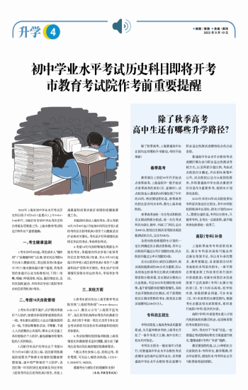 除了秋季高考,上海普通高中生在国内还有哪些升学路径,何时开始准备? 春季高考 教育部自上世纪90年代开始试点春季高考。上海是较早一批开始试点春季高考的省份(区、直辖市),试点院校也从最初的8所增加到了今年的25所。特别要说明的是,春季高考的招生层次均为本科,都为上海本地院校。 春季高考由统一文化考试和院校自主测试两部分组成。统一文化考试科目为语文、数学、外语三门科目,总分为450分。院校自主测试采用面试或技能测试的方式,总分为150分。 各招生院校根据招生计划的一定比例确定自主测试资格线,其中公办院校不超过公布计划数的2倍,民办院校不超过公布计划数的3倍。 在1比2甚至1比3的自主测试中,面试或技能测试的150分尤为重要,而从各校给出的春考自主测试分数线和预录取分数来看,自主测试分数的占比也很高。不过2022年的情况较为特殊,鉴于新冠肺炎疫情防控情况,各校无法开展院校自主测试,对于获得院校自主测试资格的考生,院校自主测试成绩均以150分计入。 专科自主招生 专科自招是上海高考体系的重要组成,为无意冲刺本科的上海考生开拓了一条升学成才之路,高中生和三校生均可报名。 专科自主招生一般在每年3月进行,对普通高中学业水平合格性考试成绩齐全的高中应届毕业生,采用普通高中学业水平合格性考试成绩与职业适应性测试成绩相结合的办法录取。 普通高中学业水平合格性考试成绩折算办法与职业适应性测试考核方式,以及两者分值比例,均由试点院校自主确定,并在招生章程中公布。试点院校以总分从高到低排序,并将普通高中学生综合素质评价信息作为重要参考,按招生计划择优录取。 2022年共有31所试点院校参加专科层次依法自主招生,其中29所院校招收高中应届生,招生计划约3600人。需要注意的是,专科自主招生,只能考专科,且考生一旦被录取,就不能再参加秋季统一高考了。 高职(专科)补录 上海秋季高考专科录取结束后,部分专科层次高校可能会存在新生报到不足,所以有补录的需求。教育部规定,各省级招办对所有高校的本科层次招生,一律不得在常规录取工作结束后再行组织补录或换录;对新生报到后未完成国家下达的高职(专科)生源计划的省(区、市)内有关高校,经学校申请、省级招委会同意,可在本省(区、市)未录取的生源范围内,根据考生志愿及相关录取要求,组织进行高职(专科)层次的补录。 高职(专科)补录是考生进入计划内统招高校的最后机会,还没被录取的考生要及时关注。 另外,考生对于“补录”信息,一定要通过考试院网站等官方渠道进行核实,警惕高职(专科)“补录”陷阱。 最后要说明的是,以上3种招生方式录取的本/专科学生,修学期满,符合毕业要求,颁发的本/专科毕业证书与秋季高考是相同的。