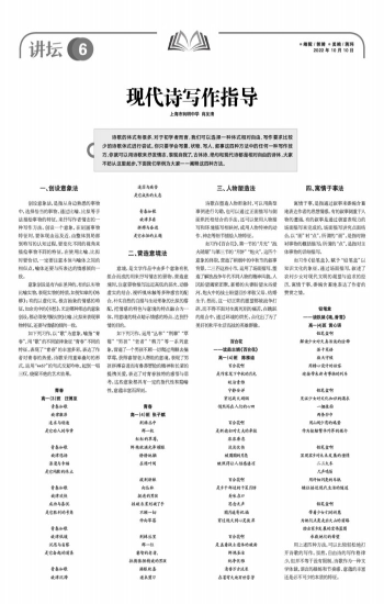 上海市向明中学 肖友清 诗歌的体式有很多,对于初学者而言,我们可以选择一种体式相对自由、写作要求比较少的诗歌体式进行尝试。你只要学会写景、状物、写人、叙事这四种方法中的任何一种写作技巧,你就可以用诗歌来抒发情志,表现自我了。古体诗、绝句和现代诗都是相对自由的诗体,大家不妨从这里起步。下面我们举例为大家一一阐释这四种方法。 一、创设意象法 创设意象法,是指从身边熟悉的事物中,选择恰当的事物,通过比喻、比拟等手法描绘事物的特征,来抒写作者情志的一种写作方法。创设一个意象,在刻画事物特征时,要体现由远及近、由整体到局部到特写的认知过程,要变化不同的视角来描绘事物不同的特征。在使用比喻、比拟时要恰切,一定要注意本体与喻体之间的相似点,喻体还要与所表达的情感倾向一致。 意象创设是有内在差异的,有的以实物比喻实物,表现实物的特质,如贺知章的《咏柳》;有的以虚化实,极言抽象的情感的特征,如余光中的《乡愁》。无论哪种形态的意象创设,都必须使用贴切的比喻、比拟来表现事物特征,还要与情感的倾向一致。 如下列习作,以“歌”为意象,喻指“青春”,用“歌”的不同旋律象征“青春”不同的特征,表现了“青春”的丰富多彩,表达了作者对青春的热爱。诗歌采用重章叠句的形式,运用“4457”的句式反复吟咏,起到一唱三叹、绕梁不绝的艺术效果。 青春 高一(3)班 汪博至 青春如歌 旋律激昂 追求与创造 是它动人的华章 青春如歌 旋律悠扬 浪漫与幸福 是它间歇的休止 青春如歌 旋律欢快 成功与喜悦 是它胜利的号角 青春如歌 旋律低缓 沉思与省察 是它奋起的前奏 青春如歌 旋律沉滞 迷茫与痛苦 是它成长的太息 青春如歌 旋律多姿 拼搏与奋进 是它永恒的主题 二、营造意境法 意境,是文学作品中由多个意象有机组合而成的用来抒写情志的景物。营造意境时,注意景物描写远近高低的层次、动静虚实的结合、视听嗅味触等多种感官的配合,朴实自然的白描与生动形象的比拟的搭配,把情感的特色与意境的特点融合为一体,用意境的特点暗示情感的特点,达到抒情的目的。 如下列习作,运用“丛林”“荆棘”“草莓”“男孩”“老者”“剪刀”等一系列意象,营造了一个男孩不顾一切爬过荆棘去摘草莓,获得睿智老人帮助的意境,表现了男孩拼搏奋进而有鲁莽冒险的精神和长辈的提携关爱,表达了对青春独特的感悟与思考。这些意象都具有一定的指代性和隐喻性,意蕴丰富而深刻。 青春 高一(4)班 张子麒 荆棘丛中 那一枚 红红的草莓,鲜艳欲滴光泽耀眼 静静地躺 在绿叶间 披荆斩棘 向丛林 挺进的男孩 挂破衣裳划破了手 不顾一切 伸向草莓 荆棘丛里 那一位 睿智的老者, 扶携狼狈精疲的男孩 满眼欣喜 递来剪刀 三、人物塑造法 诗歌在塑造人物形象时,可以用典型事例进行勾勒,也可以通过正面描写与侧面烘托相结合的手法,还可以使用人物描写和环境描写相映衬,或用人物传神的动作、神态等细节描绘人物特征。 如习作《百合花》,第一节的“月光”“战火硝烟”与第三节的“月饼”“炮火”,这四个意象的择取,营造了硝烟中的中秋节的叙事背景,二三四这些小节,运用了场面描写,塑造了解放战争年代不同人物的精神风貌,人民盼望阖家团聚,新婚的夫妻盼望永浴爱河,炮火中的战士盼望回乡孝敬父母、结婚生子,然而,这一切正常的愿望都被战争打碎,而不得不面对生离死别的痛苦,在跳跃的组合中,通过环境的烘托,点化出了为了美好的和平生活而战的英雄群像。 百合花——读茹志娟《百合花》 高一(4)班 陈雅迪 百合花啊 是作家笔下中秋的月光 皎洁素雅 宁静安详 穿过战火硝烟 悄然泻在人们的心田 百合花啊 是新媳妇对丈夫的牵挂 浓浓眷恋 淡淡忧伤 被圆圆的月亮 映照得让人倍感凄凉 百合花啊 是乡干部送的干菜月饼 美味在口 思念无声 圆月遥寄祝福 穿过炮火到心灵彼岸 百合花啊 是盖着战士遗体的被面 鲜艳圣洁 纯净优雅清香万古流长 在苍穹大地百世芬芳 四、寓情于事法 寓情于事,是指通过叙事来委婉含蓄地表达作者的思想情感。有的叙事侧重于人物的遭遇,有的叙事是通过极富表现力的场面描写来完成的,场面描写讲究点面结合,以“面”衬“点”。所谓的“面”,是指对陪衬事物的概括描写;所谓的“点”,是指对主体事物的详细描写。 如习作《铅笔盒》,赋予“铅笔盒”以知识文化的象征,通过场面描写,叙述了农村少女对现代文明的渴望与追求的经历,寓情于事,委婉含蓄地表达了作者的赞赏之情。 铅笔盒——读铁凝《哦,香雪》 高一(4)班 黄心语 铅笔盒啊 解读少女对天真活泼的诠释 若干笑语 数天守候 用精心设计的妆容 迎接带来新奇事物的列车 铅笔盒啊 见证少女对文化知识的渴求 一捆挂面 两条纱巾 用山间少有的鸡蛋 作为接触繁华外界的媒介 铅笔盒啊 显现家乡对未来发展的憧憬 二三火车 几声鸣笛 用纤细闪亮的车轨 铺往接近现代生活的隧道 铅笔盒啊 带着少女们的祈愿 为她们点亮走出大山的前路 绘出家乡发展的宏伟蓝图 承载她们的希望 用上述四种方法,可以比较轻松地打开诗歌的写作。虽然,自由诗的写作格律少,但并不等于没有限制,诗歌作为一种文学体裁,语言的凝练和节奏感、意蕴的丰富还是必不可少的本质的特征。