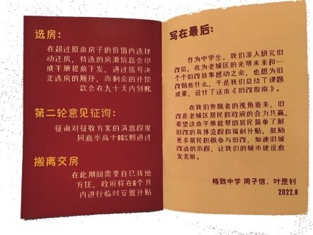 “我和周子信同学在调查走访龙泉居委旧改工作时发现,旧改流程急需一份更适合居民理解的流程手册。在我看来,旧改要顾及不太会使用智能设备且理解能力较差的老年人,最好配备相关实物手册作为指导。于是我和周子信分工,我总结旧改流程、福利等内容,制作了一份简要的《旧改方略》,而周子信同学设计了《旧改指南》。”来自黄浦区格致中学的叶昰钊和周子信同学利用今年暑假的时间,以黄浦旧改为社会实践课题,为老城厢的变迁贡献了一份青春之力。他们的实践成果将参与到2022年“未来杯”上海市高中阶段学生社会实践项目大赛的角逐。 记者 冷梅 青少年参与旧改调研体现“人民城市人民建” 近年来,政府统一征收进行旧城改造的方案正慢慢取代传统拆迁和老旧住房修缮的方法,成为旧里改造的热门新方案,并取得了突出的成绩。为了解旧改取得高速进展的秘诀,叶昰钊和周子信同学以学校附近的龙泉居委旧改过程为例进行了调查研究。叶昰钊说道:“我们通过采访龙泉居委党总支陆书记和查阅相关政府文件及新闻报道的方式,研究了旧改的具体流程和政府给居民的福利补贴,并深入了解了居民的不同想法,总结了居委的旧改经验,最后制成了一份《旧改方略》和一份《旧改指南》,希望对未来的基层一线旧改工作有所帮助。” 在这份长达7000多字的调研报告中,两名同学回溯了黄浦旧改这几年取得的成绩,也对老城厢面对的诸多问题提出了一些自己的破题思路,“旧改后不仅可以解决旧城区的问题,还可以提升城市形象,改善城市面貌,促进城市现代化。在改善人民生活质量的同时,旧改可以健全城市基础设施,促进经济发展。” 报告中既有文字讲述,也有数字表格,清晰明了地展开了黄浦区旧里拆迁一些阶段性成绩。“我希望通过对龙泉居委旧改流程和实践的研究分析,调查并介绍旧改流程及居民态度,学习总结居委会处理问题的方法和经验。最后站在中学生的视角对基层旧改工作者和旧改涉及居民分别提出一些建议,制作成手册,可以为其他街道旧改提供一些参考和帮助。”叶昰钊补充道。 数据之外,更有走访调研的一些小故事,这些故事案例也从侧面印证了旧改破题思路的一些个性化需求。 他们了解到,有一户人家,一位单亲妈妈把先天患有脑瘫的儿子抚养成人,在阴冷潮湿、采光通风极差的老房一楼生活了二十多年。旧改开始后,他们积极地参与其中,最终搬入了有阳台和电梯的公寓新房。搬迁后他们回来看望陆书记,绘声绘色地描述了新房的舒适和便利,那位单亲妈妈想起自己这么多年的不易和终于实现的美好生活,感动得热泪盈眶。两名同学的思考如下:老城厢这样的居民非常多,这让他们感觉特别心酸,所以政府需要大力推进旧改工作,让更多老城厢的居民能够改变生存现状,享受现代化的生活。 下沉一线调查,整理出12条工作方法论 通过研究,两名同学也看到了黄浦区“宝兴里旧改十法”这样的优秀工作方法,并根据实际调查走访,总结出了12条工作方法。例如,精准排摸法:对每家每户精准排摸,了解各家情况,尤其是居民的难处;换位思考法:站在居民的利益角度帮他们考虑问题,帮助他们利益最大化;学习工作法:多在居委内、街道内、区内展开旧改工作交流座谈会,让各地的旧改工作者相互学习交流工作经验;特事特办法:特殊情况下(生病、丧事等)可以专事专办,通人情;发动代表法:发动党员居民或有威信力的居民代表签约,带动其他居民;体验新生活法:可以让居民去新房体验现代生活,有利于劝说他们参与旧改;“死缠烂打”法:瞄准重点户,不断登门讲道理、做工作,不厌其烦地对话,劝说其参与旧改…… 这次调研经历让叶昰钊深有感触:“完成了课题研究后,我不禁感叹,他们是幸运的,因为他们终于遇到了旧改,更何况身边还有一心为民的旧改工作者耐心为他们服务。正如陆书记在采访中所说,‘有幸遇到旧改征收时,许多人是当局者迷,所以我们希望捧着我们一颗真心,为老百姓守住他们的利益,让他们做出最正确的选择,尽早过上自己的好日子。’正是有万千这样耐心细致、一心为民的基层旧改工作者,才有了课题开头研究背景中黄浦区旧改所取得的卓越成绩。” “作为中学生,我在课题的研究过程中既看到了老城区过去的破旧,也设想了旧改完成后老城厢更新后的繁华兴盛。在为老城区的光明未来和一个个旧改故事感动之余,我也想为旧改做些什么,于是我们总结了课题成果,对一线旧改工作者和居民分别提出了一些建议,希望对今后的旧改工作有所帮助。在未来,我也会更努力地学习,为‘人民城市人民建’贡献一份青春之力!”