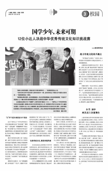 “南陈北李相约建党,主编白话文刊物《新青年》……”根据线索说出人名。 “毛泽东同志所作的某首七言律诗其中一联,这首诗表达了解放全中国的必胜信念……”根据线索说出一联诗。 “烟雨楼台革命萌生,此间曾著星星火;风云世界逢春蛰起,到处皆闻殷殷雷。”中国共产党创始人之一董必武曾为烟雨楼题写此联。此联回忆的是哪一段往事? 这些题目出现在2022“雏鹰杯”上海市红领巾喜迎二十大——“国学达人”中华优秀传统文化知识挑战赛中,赛事从传承中华优秀传统文化入手,用润物无声的方式实现少年儿童政治启蒙。12位国学小达人站上决赛赛场,通过四轮各类传统文化知识比拼,最终,上海市普陀区新普陀小学东校的杨凌瑆获得小学组冠军,上海上师初级中学的张黛伶获得初中组冠军。 记者 周胜洁 摄影 吴恺 “人”字飞花令来回近10个回合 此次“国学达人”中华优秀传统文化知识挑战赛共设有“你说我猜”“博闻强识”“火眼金睛”“荣耀巅峰赛”四轮比赛。“你说我猜”是小学组和初中组选手混龄两两组队,答对题目最多的前三组晋级,其余选手通过“博闻强识”复活赛争夺晋级名额。 最具可看性的是第三轮“火眼金睛”。绿叶艺术团的小演员们为小学组和初中组进行情景演绎,参赛选手根据演绎猜成语或说出一联诗。两位小演员扮演了祖逖与刘琨,听到鸡啼声后,俩人起来舞剑,形象演绎了四字成语“闻鸡起舞”;一位小演员扮成老妇人,对着将要进京赶考的孩子说:“为娘不求荣华富贵,求的是儿早点回家。”生动演绎了“临行密密缝,意恐迟迟归”。 最精彩的是最后一轮“荣耀巅峰赛”。初中组进行“飞花令”,关键字不仅有家国情怀的“国”,更有人民的“人”字,“习近平总书记曾在上海杨浦滨江察看浦江两岸风貌时指出:城市是人民的城市,人民城市为人民。飞花令最后一轮关键字是‘人’。”当主持人报出题目后,“白云生处有人家”“人间正道是沧桑”“夕阳西下,断肠人在天涯”“人面桃花相映红”……张黛伶和陈译睿两位初三选手你来我往,对招了近10个回合,张黛伶赢得了最后的胜利。 弘扬传统文化,展现幸福风貌 本次活动旨在让更多青少年学中华优秀传统文化、爱中华优秀传统文化、用中华优秀传统文化,在亲身参与中,提升文化自信和认同,通过推进中华优秀传统文化创造性转化、创新性发展,引领、培养能够担当民族复兴大任的时代新人,以实际行动迎接党的二十大胜利召开。 为了让大赛覆盖更多中小学生,在初期的网络海选阶段不设门槛,吸引了超过38万名中小学生参与答题。最终站上决赛舞台的12位国学小达人就是从中脱颖而出的。 同济大学教授、诗学研究中心主任、博士生导师刘强,复旦五浦汇实验学校校长、上海复旦附中特级教师、上海诗词学会理事黄玉峰,华东师范大学副教授、中国语言文学系汉语言文字学研究生导师曹洁“坐镇”决赛现场,解读“天若有情天亦老”背后的故事,出题飞花令关键字“国”,解释家国情怀,以答疑解惑的形式,让更多人了解国学知识。 市少工委主任、市少先队总辅导员赵国强表示,“国学达人”挑战赛是上海少先队开展年份最长的“雏鹰杯”课外竞赛活动,每年都受到广大少先队员和家长们的热情支持和参与,今年又成为了“喜迎二十大 争做好队员”的重要活动之一。赛事不仅弘扬了中华优秀传统文化,还激励了新时代少年从历史长河中汲取智慧和力量,展现了少先队员们以我所能为祖国、为家乡、为集体尽责任的幸福风貌。 >>>冠亚军风采 找寻传统文化的兴趣点 “我可能运气比较好。”当来自上海上师初级中学的张黛伶手捧金奖奖杯时,小姑娘谦虚地说。 决赛现场对张黛伶而言并非一帆风顺,在第三轮比赛“挑战多宫格”难度自选题时,她选择了七言古诗,找字组词时没有说出正确答案“春风十里扬州路”,遗憾扣分,在和另一名选手加时赛时也没抢到答题权,因为对方回答错误,张黛伶才进入最后一轮。但她在飞花令表现出色,说出了更多带有“人”字的古诗词,最终获得初中组冠军。 参赛时要用一句诗介绍自己,张黛伶选择了陆游的“画凌烟。上甘泉。自古功名属少年”。她特别喜欢诗句中提到的“少年”,“这仿佛是激励我前进的动力,让我有奋斗的目标。”她觉得最重要的是找到自己的兴趣点和类型,比如从喜欢的诗人入手,逐渐拓展阅读面,“只要挖掘到兴趣点,博览群书,就能不断积累。” 小学、初中两次站上决赛舞台 上海市西南位育中学的陈译睿与国学达人挑战赛的缘分深厚。5年前,小学四年级的他第一次站上决赛赛场,斩获小学组季军。如今,他以初三学生的身份再次站上决赛赛场,获得了初中组亚军。陈译睿非常喜欢国学达人挑战赛的形式和赛制设计,第二次站上这个舞台,有一种故地重游的感觉。 不过整场比赛对陈译睿是个挑战,他是从复活赛“逆袭”一路闯进了最后一轮。复活赛采取线索题抢答,每题有4条线索,陈译睿表现抢眼,其中一题“瞿秋白”的线索只出现了第一条“他是我国最早可供唱颂的《国际歌》歌词翻译者”时,他就说出了答案,“因为我了解瞿秋白就是从他作为《国际歌》翻译者的身份开始的。” 学习传统文化对陈译睿而言,在获取更多知识的同时也能真切感受到古人的心境,“人与人之间心心相印的交流是美好的,这种穿