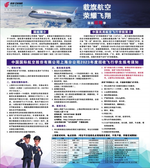 国航简介 中国国际航空股份有限公司简称“国航”,其前身中国国际航空公司成立于1988年。国航是中国载旗飞行的民用航空公司, 是星空联盟成员,也是2022年北京冬奥会和冬残奥会官方航空客运合作伙伴,在航空客运、货运及相关服务诸方面,均处于前列。2021年,经世界品牌实验室测评,国航的品牌价值为人民币1,972.36亿元。截至2021年12月31日,国航(含控股公司)共拥有以波音、空中客车为主的各型飞机746架,平均机龄8.23年;经营客运航线已达672条,通航国家及地区25个,通航城市151个,通过与星空联盟成员等航空公司的合作,将服务进一步拓展到195个国家(地区)的1300个目的地。 中国民用航空飞行学院简介 中国民用航空飞行学院简称中飞院 (CAFUC),是中国民用航空局直属的全日制普通高等学校,入选联合国重点推广的“MPL”课程试点单位、四川省“双一流”建设计划。建校以来已为中国民航培养了无数的飞行员、机长、功勋飞行员和特级飞行员,被誉为中国民航飞行员的“摇篮”、中国民航管理干部的“黄埔”。其前身是1956年5月成立的中国民用航空局航空学校。1987年12月, 经国家教委批准, 升格为全日制普通高等本科学校, 并更名为中国民用航空飞行学院。2019年,中飞院飞行技术专业获批为国家一流本科专业建设点。学校在四川新津、广汉、绵阳、 遂宁和河南洛阳建有5个飞行训练分院,在国内有若干合作飞行训练基地。 中国国际航空股份有限公司上海分公司2023年度招收飞行学生报考须知 一、招生计划: 中国民用航空飞行学院:拟招收30名高中飞行学生(国航股份送培) 最终送培院校计划数以上海市教育考试院实际发布招生数计划为准。 二、招收范围和条件: 1.上海市2023年高中毕业生,男性,年龄必须为16周岁—20周岁(公历2003年9月1日- 2007年8月31日出生)。 2.身高168厘米—188厘米;体重符合民航招收空勤学生体重指数标准。裸眼视力不低于0.1;近视屈光度不超过450度,远视屈光度不超过300度,屈光参差不大于250度,散光不超过200度;18周岁前不可做角膜屈光手术(术后6个月方可参加体检);佩戴角膜塑形镜者在塑形效果消失后方可参加体检。 3.政治条件符合民航招收空勤学生有关规定。 4.报考飞行技术专业的考生,外语限考英语,物理、化学两门须至少选考其中一门;录取最低控制分数线按文化课总分60%(396分)执行;英语高考单科原始成绩达到95分(含)以上,录取时严格按照教育部及民航局划定的高考总分从高分到低分顺序录取。 5.身体任何部位有纹身者不能报考。 三、报名相关说明: 1.报名方式及所需材料:请报名同学携带身份证、一寸免冠彩色照片一张、报名表(官网下载)、黑色水笔一支,佩戴眼镜同学须携带近两个月内开具的验光单(眼镜店或医院均可)。 2.报名时间、地点:请报名同学于2022年11月5日-11月26日前往就近面试点报名(详见面试安排)。 3.疫情防控要求:参加现场面试同学须持有24小时核酸阴性报告方可进入面试区域,进入面试区域需佩戴口罩、测量体温、手部消毒,做好个人防护。 4.面试合格后由公司组织学生进行体检及背景调查,全部合格者参加2023年全国高考。 四、联系方式: 国航上海招飞办公室地址:上海虹桥机场迎宾三路199号国航大厦707室 咨询电话:18918215668 陈老师 咨询时间:9:00-19:00 公司网址:http://zhaopin.airchina.com.cn(点击页面左侧“飞行员招聘”下载报名表) 五、温馨提示: 1.考生现场报名后参加的面试为通用面试,考生无须提前准备。 2.招飞体检为第三方体检,故每位同学只能参加一次体检,各招飞单位可共享结果。 3.为增加报考学生最终成为飞行员的机会,建议报考学生在报名面试阶段尽量兼报不同的航空公司,以便可以有更多选择。(重要) 具有下列情况之一者,不能报考国航飞行学员: 1.男生身高不足168厘米或超过188厘米; 2.视力低于0.1(C字表)、斜眼、色盲、色弱; 3.心血管系统疾病; 4.慢性胃肠道疾病; 5.严重传染病:HBsAg阳性; 6.慢性肾炎或血尿、蛋白尿; 7.精神病家族史、癫痫病史; 8.颜面五官明显不对称; 9.晕车、晕船; 10.明显口吃; 11.耳朵流过脓、听力差、经常耳鸣; 12.骨与关节疾病或畸形; 13.久治不愈的皮肤病,如头癣、湿疹、牛皮癣、慢性荨麻疹等; 14.活动性肺结核; 15.较重的砂眼或倒睫。