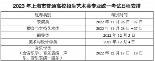 2023年上海市普通高校招生艺术类各专业类别(表演类、播音与主持艺术类、编导类、美术与设计学类、音乐学类)统一考试将于2022年11月26日开始陆续举行(考试日程安排详见下方)。已报名参加相关专业类别统考的考生须根据各类别考试安排,提前做好个人防疫管理。 >>>2023年上海市普通高校招生艺术类专业统一考试防疫提醒 1.考生应在考前14天完成“随申码”注册或“亲属随申码”申请,同时下载打印《考生考试安全承诺书》(以下简称《承诺书》)。考生应做好备考期间个人日常防护和健康监测,按要求如实、完整填写《承诺书》中的相关信息并签字确认,考生对《承诺书》内容的真实性负法律责任。 2.考前14天内,考生若出现发热(体温≥37.3℃)、咳嗽、咽痛、呼吸困难、呕吐、腹泻等症状,应及时就医,并进行核酸检测。考试当日必须提供考前24小时内核酸检测阴性报告(电子版或纸质版均可,下同)。 3.考生若有境外或非低风险地区活动轨迹的,按本市疫情防控最新规定要求处理。具备考试条件的考生方可参加考试。 4.考前14天起,考生非必要不离沪,考前7天应在沪。若有离沪情况或从外省市来沪赴考的考生必须提前向就读学校(社会考生向报名所在区招办)报备,并在考试当日提供考前24小时内核酸检测阴性报告。 5.考前3天,考生须在沪每天完成1次核酸检测且结果均为阴性,每次核酸检测间隔应超过24小时。考试当天入场前24小时内须有一次。 6.考试当日,请考生按准考证或考点规定的时间提前到达考点,预留足够时间配合考点工作人员进行防疫检查和身份核验。考生须持填写完整的《承诺书》、纸质版准考证和有效身份证件原件(提醒:电子身份证不作为考试入场有效证件使用),经查验通过后进入考点。考生在参加各专业类别统考的首场考试时均须携带《承诺书》进入考点,并在进入考场时交予监考员。 7.考生入场时,须听从考点安排在指定考场或场次进行考试。 8.考试当日,考生入场时检测体温正常,但在考试过程中出现干咳、发热、气促、流涕、腹泻等异常状况,须听从考点安排,按要求进行考试。 9.考生须自备一次性医用口罩。除入场时核验身份环节外,建议全程佩戴口罩。备用隔离考场考生在考试过程中必须全程佩戴口罩。 10.考试期间,请家长保持手机联络畅通。考试结束后,考生听从考点安排分批、错峰离场。家长如有接送考生的,应服从公安和考点工作人员管理,避免在考点门口聚集。 11.其他未尽事宜,参照本市最新防疫要求和各类别考试考前提示执行。