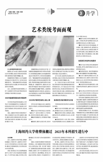 文/上海市教育考试院 刘玉祥 编者按:由于2023届上海高考生的总数比往年有所增加,因此艺术类统考各类别的报考人数均较往年呈现不同幅度上涨。 根据教育部文件精神,2024年起编导类将退出艺术类统考行列,与其相关的戏剧影视文学、广播电视编导等专业将直接依据考生高考文化成绩、参考考生综合素质评价开展录取。 近日,上海市教育考试院专家撰文,介绍了上海目前艺术类专业统考现状和未来改革趋势,考生和家长关注起来。 2024年起编导类退出艺术类统考 艺术类统考是高考的组成部分,对艺考生升学发挥着重要作用。其成绩应用于秋季高考本专科艺术类平行段录取,但不适用于春季高考、专科自主招生和三校生高考录取。 目前,上海组织开考的艺术类统考有5个类别,分别是美术与设计学类、编导类、表演类、播音与主持艺术类和音乐学类。其中,音乐学类又细分为音乐学、音乐表演-声乐、音乐表演-器乐3个小类。 根据教育部2021年发布的《关于进一步加强和改进普通高等学校艺术类专业考试招生工作的指导意见》精神,2024年起编导类将退出艺术类统考行列,与其相关的戏剧影视文学、广播电视编导等专业将直接依据考生高考文化成绩、参考考生综合素质评价开展录取。其他类别将通过完善考试科目与内容等措施,进一步提高科学化、规范化水平。按照该文件中提及的“到2024年基本实现艺术类专业省级统考全覆盖”等要求,上海届时极可能新增其他类别艺术类统考。这些变化从2024年高考起发生,2023届艺考生仍须按前述5个类别参加艺术类统考。 2023年沪报考艺统考人数上涨 多年来,每年有超过10%的上海高考生参加艺术类统考,各类别的报考热度差异比较大。 ●美术与设计学类历来是五大统考的“超级大户”,每年至少拥有六七千报考生源,占所有艺术类统考人数的八成左右。 ●编导类紧随其后,报考数每年都超过千人。 ●表演类、播音与主持艺术类、音乐学类因专业技能要求更高,需要考生花费更长时间、更多精力进行专业训练,所以报考人数相对偏少,但也各有数百人。 由于2023届上海高考生的总数比往年有所增加,因此艺术类统考各类别的报考人数均较往年呈现不同幅度上涨。 这一信息应当引起2023届艺考生重视。同类别竞争对象的增多意味着将来录取难度的加大。对于坚定走艺考升学道路的考生来说,首先要在即将到来的艺术类统考中倾注更大精力,取得更优统考成绩,有利于增强后续艺术类校考的信心,也能相对降低文化考试的压力。 各类别艺术统考要求与分值 不同类别统考的考试科目与合格要求各不相同。 ●美术与设计学类考素描、速写、色彩3科,每科满分为150分,合计满分为450分。 ●编导类考艺术常识、故事创作、影视剧评论写作3科,每科满分为100分,合计满分为300分。 ●表演类考声乐、台词、形体、表演4科,前3科每科满分为100分,表演满分为200分,合计满分为500分。 ●播音与主持艺术类考文稿朗读、图片述评、才艺展示3科,图片述评满分为200分,其余2科满分各为100分,合计满分为400分。 ●音乐学类中音乐学考乐器演奏、声乐演唱、乐理、视唱练耳4科,每科满分为100分,合计满分为400分;单报音乐表演-声乐只考声乐演唱、乐理、视唱练耳3科,单报音乐表演-器乐只考乐器演奏、乐理、视唱练耳3科,合计满分均为300分。 各类别艺术统考合格要求 ●美术与设计学类设本科合格线和专科合格线。多年来,前者均划定为270分,后者均划定为240分。 ●其余类别均各设一条本专科通用的合格线,合格分值根据当年考生成绩分布确定。 ●2022年,编导类合格线为180分,表演类合格线为300分,播音与主持艺术类合格线为240分,音乐学类考4科者合格线为210分、考3科者合格线为160分。 ●各类别均另设单科最低要求,合格分值因考试科目而异,通常为90分至20分不等。 ●考生须总分和单科均合格(报考美术与设计学类本科须至少2科各达90分),方能获得相应类别的统考合格资格。 统考合格只是填报相应类别艺术类平行段志愿的门槛条件。若想报考优质院校、专业,需要考到远高于合格线的统考成绩。同时,各类别录取需要按不同比例折算考生的艺术类统考成绩和高考文化成绩,因此文化成绩“拖后腿”也会影响录取结果。 等到统考成绩公布之后,考分或排名不够理想的考生应当理性判断是否还要坚持走艺考升学道路。对于此类考生来说,转变既定思路,将目标转移到努力提高文化成绩考普通专业或谋求专科自主招生升学未尝不是明智决断。