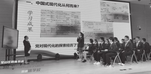 什么才是“中国式现代化”?这与高中生的关联度大吗?我如何参与中国式现代化?11月23日上午,宝山区教育系统学习贯彻党的二十大精神宣讲进学校活动正式开讲,宝山区教育工作党委书记沈杰和上海市行知中学思想政治学科教师仙慧丽给同学们带来了两堂生动的微课。 记者采访了解到,目前宝山教育已经完成了十个专题的宣讲提纲,正着力打造一批“微党课”“微团课”“微队课”,让不同教师形成备课、宣讲合力,尝试用艺术化、情感化的方式推动党的二十大精神进学校进课堂。 记者 刘春霞/文、图 党委书记给高中生宣讲党的二十大精神 什么才是“中国式现代化”?这与高中生的关联度大吗?课堂上 ,沈杰一上来就向现场的行知中学学生提出了问题。随即,他详细介绍了“中国式现代化”的内涵,并与学生们共同展望2035年、本世纪中叶的中国是什么景象,家乡宝山是什么模样,对焦自己又将在什么位置,引发了学生的热烈讨论。 “2035年,我可能又回到行知中学,成为一名理科教师,为祖国培育英才。”行知中学高二学生谭哲学想成为一名人民教师,更想回到母校教书育人。陈远卓同学的梦想是成为一名科研人员,为祖国科技发展奉献自己的力量。陈睿瑜同学则把自己的未来和家乡宝山的发展紧密联系在一起,“到本世纪中叶,我们宝山已经发展成为科技水平极高的科创之城。” “到2035年,甚至到本世纪中叶,你们已经迅速成长起来,三十而立的你们更加自信,更加阳光,更加敢作敢当,你们可能是中国近现代以来最自信的一代!”沈杰告诉学生们,党的二十大报告指出,十年来,我们完成脱贫攻坚、全面建成小康社会的历史任务,实现第一个百年奋斗目标,“这十年,也是新时代中国青年飞速成长的十年,有无数的青春面庞从见证者到奉献者,将自己的青春燃烧在祖国最需要的地方,把青春的华章写在祖国大地上,在党和人民最需要的地方绽放青春风采。” 在沈杰通俗易懂的讲述中,学生们全身心浸润到党和国家的宏大叙事中,通过对祖国发展的回望、与西方发展的比较,了解了中国式现代化新道路是中国智慧、中国方案的集中体现,也是人类文明发展的新形态和新样式。沈杰勉励同学们,要坚定理想信仰、扎实学识涵养,立足新时代、担当新使命、奋进新征程。 思政老师生动形象讲解“中国式现代化” 围绕沈杰微宣讲提到的“中国式现代化”,行知中学思想政治学科教师仙慧丽又带领学生们上了一堂生动形象的思政课。 中国式现代化从何而来?中国式现代化有何特征?我如何参与中国式现代化?课前,仙慧丽老师先让同学们通过查阅资料,对中国共产党对现代化的探索历史进行了解。课堂上,她带领学生们探究中国式现代化的内涵和特征,辩证把握中国式现代化的意蕴。而针对“我如何参与中国式现代化”这一问题,仙慧丽老师先让同学们畅谈了职业规划,又带领大家分析、领悟中国式现代化为自己的职业规划提供了哪些机遇。 “党的二十大报告中,其实为我们各位同学将来所要从事的职业、你的个人理想作了很多方向指引,它就像一个‘指南针’,指引着我们的个人职业、个人理想。”仙慧丽老师告诉大家,不管将来想从事哪方面的工作,不管个人理想是怎样的,在中国式现代化的时代大背景下,都能找到自己的机遇,而作为新时代青年,也要积极主动地贡献青春力量,实现自己与中国式现代化的“双向奔赴”。 “党的二十大开幕时,我收看了直播,当时感觉二十大报告非常宏观、非常深刻,但其中一些内容我也不是特别理解,今天仙老师这堂生动的思政课,让我对二十大报告的内容有了更深刻的理解,我清晰地认识到,二十大报告跟我自己的生活和未来发展是紧密联系在一起的。”行知中学高二(1)班学生滕菲说,听完沈杰书记和仙慧丽老师的两堂微课,自己深切感受到,中国式现代化既走中国特色的社会主义发展道路,又体现了以人民为中心的发展思想,“党的二十大在新时代为我们开启了一个更加广阔的时代舞台,作为新时代的中国青年,我们要在这个更大的历史舞台上继续发挥自己的时代使命,把自己个人的理想同国家的需要有机结合起来。” 除了学生,现场的基层宣讲员们也收获满满。宝山中学党支部书记吴卫忠表示,他所在的宣讲组都是学校党组织书记,“前期在一起备课磨课,上周还进行了试讲,随后通过线上会议讨论修改。下周,进学校的宣讲就要全面启动了!” 宝山区教育工作党委书记沈杰表示,宝山教育正积极推进党的二十大精神宣讲进校园活动,“我们充分调动学校党组织书记、道德与法治教师、‘青语’宣讲队、‘红领巾巡讲团’力量,形成大备课组、大教研组,在党校专家、高校专家的指导下,目前已经形成了十个专题的宣讲提纲,我们想着力打造一批微党课、微团课、微队课,通过不同层面教师的宣讲,把二十大精神传递到校园,传递到每个学生心中。”