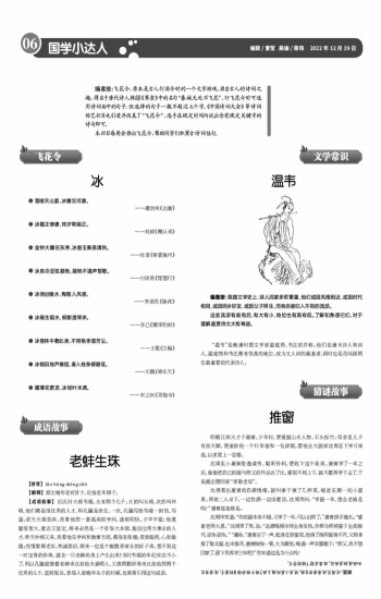 编者按:飞花令,原本是古人行酒令时的一个文字游戏,源自古人的诗词之趣,得名于唐代诗人韩翃《寒食》中的名句“春城无处不飞花”。行飞花令时可选用诗词曲中的句子,但选择的句子一般不超过七个字。《中国诗词大会》等诗词综艺栏目也引进并改良了“飞花令”,选手在规定时间内说出含有规定关键字的诗句即可。 本栏目每周会推出飞花令,帮助同学们积累古诗词佳句。 ● 雪暗天山道,冰塞交河源。 ——虞世南《出塞》 ● 冰霜正惨凄,终岁常端正。 ——刘桢《赠从弟》 ● 金钟大镛在东序,冰壶玉衡悬清秋。 ——杜甫《寄裴施州》 ● 冰泉冷涩弦凝绝,凝绝不通声暂歇。 ——白居易《琵琶行》 ● 冰消出镜水,梅散入风香。 ——李世民《除夜》 ● 冰痕生砚水,柳影透琴床。 ——齐己《赠李明府》 ● 冰雪林中著此身,不同桃李混芳尘。 ——王冕《白梅》 ● 冰销田地芦锥短,春入枝条柳眼低。 ——元稹《寄乐天》 ● 霜薄花更发,冰轻叶未凋。 ——宋之问《灵隐寺》