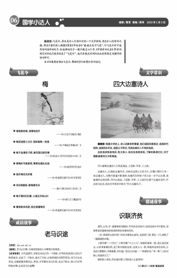编者按:飞花令,原本是古人行酒令时的一个文字游戏,源自古人的诗词之趣,得名于唐代诗人韩翃《寒食》中的名句“春城无处不飞花”。行飞花令时可选用诗词曲中的句子,但选择的句子一般不超过七个字。《中国诗词大会》等诗词综艺栏目也引进并改良了“飞花令”,选手在规定时间内说出含有规定关键字的诗句即可。 本栏目每周会推出飞花令,帮助同学们积累古诗词佳句。 ● 墙角数枝梅,凌寒独自开 ——宋•王安石《梅花/梅》 ● 梅须逊雪三分白,雪却输梅一段香 ——宋•卢梅坡《雪梅•其一》 ● 梅子金黄杏子肥,麦花雪白菜花稀 ——宋•范成大《四时田园杂兴•其二》 ● 黄梅时节家家雨,青草池塘处处蛙 ——宋•赵师秀《约客》 ● 挼尽梅花无好意 ——宋•李清照《清平乐•年年雪里》 ● 来日绮窗前,寒梅著花未 ——唐•王维《杂诗三首•其二》 ● 梅子黄时日日晴,小溪泛尽却山行 ——宋•曾几《三衢道中》 ● 看取晚来风势,故应难看梅花 ——宋•李清照《清平乐•年年雪里》
