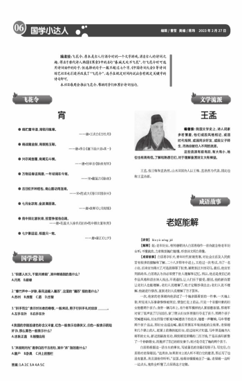 编者按:飞花令,原本是古人行酒令时的一个文字游戏,源自古人的诗词之趣,得名于唐代诗人韩翃《寒食》中的名句“春城无处不飞花”。行飞花令时可选用诗词曲中的句子,但选择的句子一般不超过七个字。《中国诗词大会》等诗词综艺栏目也引进并改良了“飞花令”,选手在规定时间内说出含有规定关键字的诗句即可。 本栏目每周会推出飞花令,帮助同学们积累古诗词佳句。 ● 晓贮露华湿,宵倾月魄寒。 ——唐•王贞白《白牡丹》 ● 晓战随金鼓,宵眠抱玉鞍。 ——唐•李白《塞下曲六首•其一》 ● 兴尽闻壶覆,宵阑见斗横。 ——唐•杜审言《除夜有怀》 ● 万物迎春送残腊,一年结局在今宵。 ——宋•戴复古《除夜》 ● 七月坐凉宵,金波满丽谯。 ——唐•袁晖《七月闺情》 ● 吉日初开种稻包,南山雷动雨连宵。 ——宋•范成大《春日田园杂兴》 ● 苑中排比宴秋宵,弦管挣摐各自调。 ——唐•花蕊夫人徐氏《宫词•苑中排比宴秋宵》 ● 七夕景迢迢,相逢只一宵。 ——唐•清江《七夕》