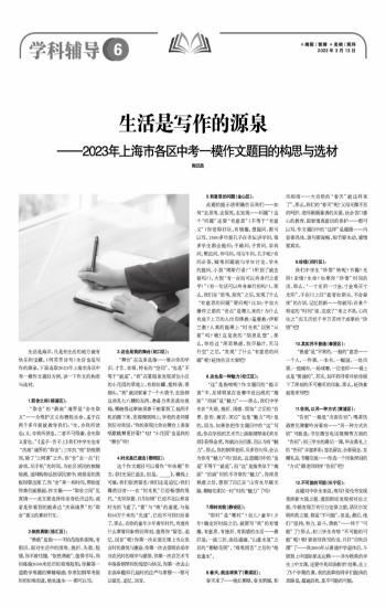 陶汉昌 生活是海洋,凡是有生活的地方就有快乐和宝藏。(何其芳诗句)生活也是写作的源泉。下面选取2023年上海市各区中考一模作文题目为例,讲一下作文的构思与选材。 1.取舍之间(杨浦区): “取舍”的“最高”境界是“舍生取义”——为维护正义而牺牲生命。孟子在两千多年前就教导我们:“生,亦我所欲也;义,亦我所欲也。二者不可得兼,舍生取义者也。”《孟子·告子上》我们中学生也有“次高”境界的“取舍”:三年抗“疫”防疫期间,除了“上网课”之外,你“舍”去一点“打游戏,玩手机”的时间,为社区居民的核酸检测,送网购物品到居民家中;班级里的黑板报要出版了,你“舍”弃一些时间,帮助宣传委员画插画,抄文稿——“取舍之间”见真情——此文要选择你亲身经历过的,或者是你看到的能表达“次高境界”的“取舍”要义的素材行文。 2.依然勇敢(徐汇区): “勇敢”是指——不怕危险和困难,有胆识。面对生活中的困难、挫折、失败、险情,你不曾怯懦,“依然勇敢”,值得书写。你训练跑1000米经历的艰难险阻;你解答一道数学难题的殚精竭虑;你参加钢琴考级时的知难而进,绝处逢生……都可以写。 3.这也是我的舞台(虹口区): “舞台”在这里是指——展示你的学识、才艺、本领、特长的“空间”。“也是”不等于“就是”。“我”在暑假里发现居住小区的小花园的草地上,有易拉罐、塑料袋、香烟头,“我”就回家拿了一个大袋子,去捡掉这些乱七八糟的东西。准备分类丢进垃圾桶。哪晓得这事被居委干部看到了,她用手机拍摄下来,发视频到网上,学校的老师看到后对我说:“你的表现比你在舞台上表演唱歌跳舞更好看!”哇!“小花园”也是我的“舞台”呀! 4.时光虽已逝去(崇明区): 这个作文题目可以看作“半命题”作文:《时光虽已逝去,但是,_________》,横线上可填:我们依然留恋/我们还是追忆/我们蓦然回首……在“时光机”已经畅想的现代,“光阴似箭,日月如梭”已经不足以形容时光的飞逝了。“箭”与“梭”的速度,与每秒30万千米的“光速”,已经不可同日而语了。那么,在你的童年少年青年时代,究竟有什么事情印象特别深刻,值得你“留恋、追忆、回首”呢?你第一次在语文课上当众发言时的喜悦与激奋,你第一次去崇明农场学当农民时的艰辛与感悟,你第一次在艺术节中演奏钢琴时的惶恐与快乐,你第一次去山东曲阜瞻仰孔庙时的庄严与肃穆……都可以留恋、追忆、回首。 5.有意思的问题(金山区): 此题的提示语明确告诉我们——如何“去思考,去探究,去发现——问题”?这个“问题”还要“有意思”(不等于“有意义”)你觉得好玩,有情趣,想提问,都可以写。2500多年前孔子在杏坛讲学时,很多学生都会提问:子路问,子贡问,宰我问,樊迟问,仲弓问。司马牛问。孔子呢?有问必答,疑难问题就与学生讨论。学生的提问,小到“闻斯行诸?”(听到了就去做吗?),大到“有一言而可以终身行之者乎?”(有一句话可以终身奉行的吗?)。那么,我们在“思考,探究”之后,发现了什么“有意思的问题”要问呢?比如:宇宙大爆炸之前的“奇点”是哪儿来的?为什么有成千上万的人信仰佛教/基督教/伊斯兰教?人真的能乘上“时光机”回到“从前”吗?哦!这是我的“胡思乱想”。那么,你经过“深思熟虑,绞尽脑汁,天马行空”之后,“发现”了什么“有意思的问题”呢?赶快告诉大家吧! 6.这也是一种魅力(松江区): “这”是指啥呢?作文题目的“提示语”中,足球明星在竞赛中没出线的“掩面”“泪崩”是“魅力”——那么,我们中学生在“失败、挫折、困惑、烦恼”之后的“自责、悲伤、痛苦、哭泣”也是“魅力”吗?是的。因为,如果你把作文题目中的“这”写成:你在学校的艺术节上演奏钢琴曲《欢乐颂》获得金奖,你就沾沾自喜,自以为有“魅力”。那么,你的钢琴老师,贝多芬大师,会认为你有“魅力”吗?因此,这道题目中的“也是”不等于“就是”,而“这”是指类似于“掩面”“泪崩”时的不寻常的“魅力”。你深思熟虑之后,想到了自己在“山穷水尽疑无路,柳暗花明又一村”时的“魅力”了吗? 7.那时的我(静安区): “那时”是“哪时”?幼儿?童年?少年?确定好时段之后,就要写“我”的有情趣、有意思、有挫折、有困惑的生活——最好是:一波三折,曲径通幽,“山重水复”之后的“柳暗花明”,“艰难困苦”之后的“绝处逢生”。 8.春天,就这样来了(青浦区): 春天来了——桃红柳绿,春光明媚,和风细雨——大自然的“春天”就这样来了”。那么,我们的“春天”呢?父母无微不至的呵护,老师循循善诱的关爱,社会苦口婆心的教育,国家情真意切的保护——都可以写。作文题目中的“这样”是题眼——内容要具体,语句要流畅,细节要生动,感情要真实。 9.珍惜(闵行区): 我们中学生“珍惜”啥呢?书籍?光阴?亲情?生命?如果你“珍惜”时间的话,那么,“一寸光阴一寸金,寸金难买寸光阴”,子在川上曰“逝者如斯夫,不舍昼夜”的古训,记忆犹新——你就写:在某个特定的“时间”里,完成了“来之不易,心向往之”而又历经千辛万苦终于成事的“珍惜”吧! 10.其实并不普通(奉贤区): “普通”是“平常的,一般的”意思——一个人,一件事,一本书,一幅画,一处风景,一座城市,一场球赛,一位老师——看上去是“普通的”,其实,却不同寻常并给你留下了深刻的