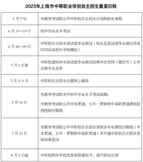 近日,上海市教育委员会发布关于做好2023年上海市中等职业学校自主招生工作的通知,2023年上海市中等职业学校自主招生工作实施日程表同时发布。中职校自主招生的面试或专业测试不得收费。 记者 郭漪 各类招生计划确定后,即向社会公布 中等职业学校(以下简称“中职校”)自主招生包括中本教育贯通培养模式(以下简称“中本贯通”)、五年一贯制培养模式(以下简称“五年一贯制”)和中高职教育贯通培养模式(以下简称“中高职贯通”)、中职校提前招生(需面试或测试的专业)共三个类别。各类别招生计划由市教委统筹后下达。 各类招生计划确定后,即向社会公布。各招生学校须严格按照已公布的计划招生,如需变更计划,须经市教委同意后方可实施。 中职校自主招生录取的学生须具有2023年中招报名资格并完成报名,且须参加上海市初中学业水平考试(以下简称“学业考试”),并获得统一考试科目的有效成绩。持外国护照以外籍身份报名且参加学业考试的学生不参加中职校自主招生录取。中本贯通只招收符合本市中招报名条件的本市户籍学生(独立设置的艺体类中职校试点专业除外)。 志愿在市级统一平台进行网上填报 招生学校根据专业特点自主确定中本贯通、五年一贯制和中高职贯通招生是否进行面试或专业测试。中职校提前招生专业限需进行面试或专业测试的专业。组织线下面试或专业测试的招生学校,需制定线下面试或专业测试工作流程、应急预案,尽量防止人员聚集。线下面试或专业测试方案须报上级主管部门审核同意方可公布组织实施。学校可通过线上方式进行面试或专业测试。采取线上面试或专业测试的招生学校,要对软件平台的适用性、安全性、可靠性和稳定性等功能进行充分评估。 2023年本市中职校自主招生志愿填报统一在学业考试后、成绩发布前进行。志愿在市级统一平台进行网上填报。填报完成后,学生本人及家长(监护人)须进行书面确认。 凡报考中职校自主招生的学生,应在规定时间内登录“上海招考热线”网站填报志愿。中本贯通可以填报2个志愿,五年一贯制和中高职贯通可以填报合计3个志愿(五年一贯制专业和中高职贯通专业可以兼报),中职校提前招生可以填报4个志愿。三类志愿可同时兼报。报考有面试或专业测试要求专业的学生,应是参加过相关招生学校组织的面试或专业测试,并进入“中职校自主招生资格库”的学生。学生填报志愿时要符合学校招生章程中所规定的要求,若因不符合招生要求而被学校退档的学生无法再被其他学校录取,责任由学生及家长自负。 自主招生录取为平行志愿原则 中职校自主招生录取工作由市教育考试院按学校计划和招生要求,根据学生学业考试总成绩(含政策性照顾加分,下同)和志愿,按照“分数优先、遵循志愿、一轮投档”的平行志愿原则,由高分到低分,按1:1比例进行网上投档录取(末位同分时,则采用末位同分同投进行投档录取)。录取顺序依次为中本贯通录取、五年一贯制和中高职贯通录取、中职校提前招生录取。 中本贯通录取学生的学业考试总成绩须达到本市公办普通高中最低投档控制分数线。五年一贯制和中高职贯通录取学生的学业考试总成绩须达到市统一划定的最低投档控制分数线。中职校提前招生类别若个别专业因录取人数太少而无法成班,招生学校可根据学生志愿、计划及招生章程等在本校同类别其他专业中进行调剂。学生如果被中职校自主招生志愿录取,其后续的志愿(即名额分配综合评价录取和统一招生录取志愿)自然失效;未录取的学生则自动进入后续其他录取批次。 各招生学校须在5月上旬通过市教育考试院系统平台报送《2023年上海市中等职业学校自主招生章程核准备案表》,市教委对学校招生章程进行核实、备案。经审核备案的招生章程不得擅自更改。招生章程经市教委备案后,各招生学校应及时向社会公布。学校法定代表人应对本校招生章程及有关宣传材料的真实性负责。市教委将对招生学校招生章程的执行情况进行督查。