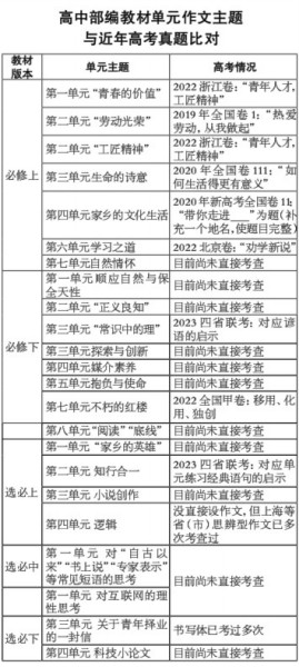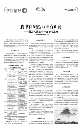 上师大康城实验学校 高级教师 程立海 高考作文是语文学科赢得高分的关键之所在。尤其是临近高考前的几周时间里,师生更应该在作文上发力,力争有更好、更大、更稳的发挥。那么,高考作文最后几周时间里最为奏效的备考的战略与抓手是什么呢?总体原则就是要做到:胸中有丘壑,眼里存山河。具体来看: 一、以课本为“本” 毫无疑问,语文课本中各单元主题作文训练是高考作文命题紧密对接的最主要、最直接、最核心的依据和根本,因此,考生应在日常进行了针对性的写作训练的基础上,要非常清楚对应的各册语文课本中每个单元主题作文的具体内容与要求,特别是这些主题作文高考是否已经关涉过、关涉到,只有这样,才能做到有的放矢地备考。请看下表: 高中部编教材单元作文主题 与近年高考真题比对 纵观上表,师生一定不能丢了课本,相反,更应该以“本”为“本”,这才是备考的关键所在与要求。 二、梳理已写“文” 回望自己在日常写作中成功与不足,吸取其中在拟题、选材、立意、语言、结构、形式等方面的长处和优势,规避存在的问题和失误,以便在考场上能够扬长避短,发挥最佳水平。 比如,一位考生在二模时围绕“信息化与智能技术”话题作文中,拟题为《长途跋涉后的归真返璞》的片段: 我们现在就处于没有真正的,属于自己的核心、自主、有用的一个阶段,如尼尔·波兹曼在《娱乐至死》中所说:“我们身处信息的海洋中,身边都是海水,却没有一滴水可以喝。”这些短平快的信息,看似上至天文,下至地理,融合古今中外,但是细细品来,又有多少是对我们的生活,对我们所热爱的东西有真正的帮助呢? 正如鲁迅先生在《拿来主义》中所描绘的“送来主义”一样,全盘被动地将外来之物纳入其中,在我们沾沾自喜时,这些信息根本没给予他们深刻的思考,只是瞬时地流过,“眼中了了,行下勿勿,方寸无多”,就算不幸把无用的信息留于脑中,这些也会如特洛伊木马一样寄居于思想之中,过多的摄取只会使人们只有广度,没有深度,甚至在潜移默化中,丢失了自己,沦为“乌合之众”,侵蚀着人们的精神家园,最终一幅“祛魅的世界无比荒凉”的景象。 所以,要将海水过滤啊!短平快的碎片化信息中也有深刻的部分,《论语》每则不过数言,却是中华文化几千年的根基,《飞鸟集》中短短三百则,却给予了多少人灵魂深处的思考。只是这些有价值的碎片化信息,如珍珠一般沉于大海之中不能轻易找到,而纵使找到了,也以一种“买椟还珠”的态度任其流走。正是这种被动的思维惯性,造就了精神家园的真正贫困。 就上文来说,标题选用的是作家木心的名言,这就启发考生:对于材料作文的拟题,既可以自己提炼语句作为文题,也可以将自己的话与名人名言结合起来拟题,更可以直接引用精当的诗句、箴言拟题,毕竟,“题好一半文”。此为其一。 第二,论据充分。作者将古今中外的事实论据与理论论据信手拈来、融为一体,既增添了论证的深刻性和权威性,又增强了语言的表现力和语言美。 第三,思路流畅。选文三个段落中,第二、第三段,分别用“正如”“所以”来承上启下,使得行文语义上衔接自然、紧密,环环相扣,逻辑缜密。而这,正是考场作文中一些考生最为缺乏和阅卷老师评分需要的。 如此看来,对自己以往所写作文的梳理与回望,不仅能够找到得失,还可以积累素材、论据,借鉴成功的语言、布局等,可谓一举多得,收获满满,何乐不为?! 三、要积淀素材 方式方法和渠道载体很多,不拘一格,如课本中,尤其是古诗文名句;报刊的阅读与摘记;收听收看广播、电视,特别是央视每晚的《新闻联播》《焦点访谈》等栏目,还有中央广播电台每天早晚6:30的“新闻和报纸摘要”节目等。需要注意的是,在储备论据素材的时候,最好能够按照“责任”“明理”“奉献”“攀登”“执着”等主题和古今中外类别来展开,兼具典型性、代表性和时代性,如是,会让你的素材和论证百花齐放,摇曳多姿,赏心悦目。 这样做,一方面能够拥有时鲜论据材料,消解“无米之炊”的困境,同时,还能化解紧张情绪,放松心灵,有利于各科备考。 四、时评的阅读 是为了事半功倍,既可以学习名家拟题、开篇、结尾、论据与论证的选用、语言的运用技法技巧,又能积累素材等。可以选取、参考的报刊、栏目有:《人民日报》《中国教育报》《光明日报》《中国青年报》等“时评专栏”的名家名作来学习、借鉴、琢磨、内化与迁移。 五、应勤于动笔 临近高考,考生往往疏于动笔,这样,就会手生、脑“废”,正所谓“用进废退”,有鉴于此,考生最好能够三天左右练习一篇完整的作文,并要按照高考的时速来严格要求自己。即使不能完整地写一篇,也要针对一个文题,列出详尽的写作思路和布局,或是写片段,让自己的思维、状态保持最佳,一鼓作气,直到高考结束的那一天。 六、可模拟评分 就是限时写就一篇练笔文,邀请同学、老师,包括本人,分别对自己的文章,依据高考评分细则进行评分,看看自己、同学、老师评分的差异,再反思、总结,找出优点和改进点,提醒自己在考场上应如何发挥优势,避免劣势,赢得高考作文的满意分值。 一言以蔽之,高考作文的备考,绝不仅限于以上方面,在此只是抛砖引玉,希冀对考生有所启发,助力考生打开和拓宽写作思路,每位考生根据各自的实际情况,在有限的时间里,让自己