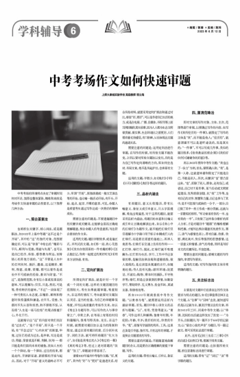 上师大康城实验学校 高级教师 程立海 中考考场的环境特点决定了审题时间相对不足、氛围也整体紧张,精准和高效是考场作文快速审题的必然要求。以下推荐几种方法: 一、契合要素法 也称抓住关键字、核心词法,或是题眼法,如2022年上海中考题“这不过是个开场”,其中的“这”的指代对象、范围要确定好,可以是“导语”中给出的“精彩与平凡,顺利与受挫,得意与失落”,也可以是自己经历、体验、感悟最为深远,刻骨铭心的其他方面的。“这”不管是人生中的任何坎坷、挫折、遭遇,还是精彩、顺利、得意、成绩、荣耀,都可以看作是成长中不可或缺的经验、教训与财富。“不过”,是指明范围,含有往小里或轻里说的意味,可以理解为:仅仅,只是,然而,可是等,带有转折的意味。“不过”一词体现了一种可贵的人生态度,在精彩、顺利和得意时保持谨慎和谦逊,在平凡、受挫、失落时不失从容和坦然,胜不骄败不馁,从而将“人生是一场马拉松”的观点根植于心,外化于行。 这就暗示出“这”的内容对我们而言是“过去式”,“是个开场”,即只是一个开场,有“不念过往”“心向未来”的展望,毕竟,过往已经成为过去,是序章,无论是成功、得意、荣誉或是不顺、荆棘、坎坷……都只能是我们面向未来的铺垫,犹如人生的一个个驿站,每一个驿站、过往的结束,都是走向、开辟新征途、新前程的开场与起点。因此,对于“开场”意义的涵咏必不可少。所谓“开场”,原指演剧或一般文艺演出等的开始,也比喻一般活动开始,有开头、开始、起点、起首、开幕的意思。可见,命题人是希望考生通过写作达成一次美好的精神成长。 需要注意的问题是:不要遗漏题目中的关键字或关键词,应能够全面而正确地理解题意,契合命题人的考查意图,写出符合要求的作文来。 适用的文题:题目字数较多,或是偏正式、并列式的文题,如《那一刻,我心花怒放》《发生在校园里的一件有趣的事》《怎么能忘记,你我一起度过的美好时光》采用本方法快速、有效。 二、定向扩展法 所谓定向扩展法,就是针对一个字或一个词的文题,这样的文题因题目的范围较大,考生如果就题审题,难度较大,在这样的情况下,考生就要对文题加以灵活、适当的变通,为自己的审题降低难度,并写出高质量的考场作文来。如以《难忘》为题写作,可以写作的人与事非常之广、非常之多,在考场上有限的时间和篇幅内,很难写得具体、充实。在这个时候,就需要对题目加以适当的限制和限定,通过在原有题目的前、后分别补充字、词的方法,就可将所给题目“化大为小”,如《他是我难忘的人》《难忘的一幕》《真的难忘》等,经过上述对原题的“改造”“加工”,审题就非常容易了。 请看2022年福州中考卷作文题:“好,更好”,其中的“好”与“更好”是递进关系,结合所给材料,就要采用定向扩展法和通过对比,彰显“好,更好”。可以是作者自己生活的地方,或是在电视、广播、自媒体、书报刊等上面耳闻目睹的真实故事,因为人人都为生态文明做贡献、做实事,生态环境比之前更好,人们都有着切身感受,有口皆碑,从而体现出文题的递进关系。 需要注意的问题是:运用定向法进行审题,在写作的时候,对所给文题不能改变,之所以要对所给文题加以变化,目的是为自己写作定向清晰的方向,即如何去选材、布局文章,绝不是另起炉灶、舍弃原有文题。 适用的文题:字数少,如《晚归》《早》《日子》《醒悟》《真好》等这样的题目。 三、品析内涵法 有些题目,意义比较隐讳,带有比喻意义、象征义或引申意义,只从字面理解,难免出现偏差,对于这样的题目,就要采用品析内涵法,将题目的本意和比喻义或引申义正确地解读出来。如以《我心中的红绿灯》为题作文,就不能把红绿灯仅仅理解为十字路口用于标示车辆或行人的红绿灯,而是要在原意的基础上,再深入地思考:红绿灯在交通上负有的作用——红灯停、绿灯行。据此,红绿灯就不难理解为:红灯即为生活、学习、工作中不应该做的事,是触犯法律法规和道德底线、做人底线的,是应该坚决规避的言行,如随地吐痰;待人没有礼貌;破坏环境;说谎话、不诚实;购物、乘车时的插队,不守秩序等;绿灯,则是应该做到的事情,如勤奋学习、帮助同学、见义勇为、拾金不昧、真诚友善、和谐相处等。 再如2022年湖南娄底中考作文题:“以青春为笔”,就需要运用品析内涵法审题。首先,题目中核心词含义的品析与理解。“以”,有用、凭借等意义;“青春”,可作这样几种解释:指青年时期,年纪轻;年龄,年岁;美好的时光,珍贵的年华。“笔”,原指写字画图的用具、工具。这里应该是引申意,指书写。只有这样的审题,才是契合文题要求的写作。 需要注意的问题是:不能随意地曲解题目的含义,而是要在正确理解的前提下审题、写作。 适用的文题:带有比喻义、引申义、象征义的文题。 四、厘清范畴法 即对文章的写作对象、主体、主次、范围等进行审视,以便确立写作的内容。如写作《我所经历的一件事》,就限定了写作的主体是“我”,而不能是他人;“经历的”,就意谓着不可以是道听途说的,而是真实的;“一件事”,不可以写成几件事。类似的题目很多:《给我教益的班会课》《我的好伙伴》《谢谢你的好意》等。 再以2022年贵阳中考作文题:“我也出了一份力”为例,首先,要明