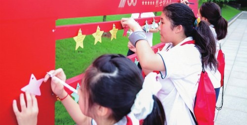 在庆祝中华人民共和国成立74周年之际,各中小学纷纷以自己的方式欢度中秋国庆,为祖国母亲的华诞呈上祝福,在同学们的心间播撒爱国主义的种子。 记者 刘昕璐 郭漪 英烈公祭城市定向活动展报国志 10月1日,一场上海市英烈公祭城市定向活动在龙华烈士陵园展开,现场庄严肃穆,礼兵向革命烈士敬献花篮,来自上海市位育初级中学、上海市南洋模范初级中学以及上海民办南模中学的100多名中学生面向龙华墙,手持菊花,低头静立,向为民族解放和人民革命事业英勇献身的革命先烈三鞠躬。接着,同学们以小组为单位独立完成打卡任务,学生们很快进入状态,激情高涨。大家手持任务书在园区内寻找点位打卡。 学生们在龙华监狱遗址区内找到了张恺帆床铺上的七绝诗。这首《狱中诗》将桃花与革命先烈的精神紧紧地联系在了一起。大家纷纷感慨,对英雄烈士最好的纪念,就是传承好他们的精神。 根据活动任务书,学生们又快速移步至龙华碑苑《且为忠魂舞》大型烈士群雕前,学生们每人一句深情并茂地吟诵毛泽东词《蝶恋花·答李淑一》:“寂寞嫦娥舒广袖,万里长空且为忠魂舞……” 在龙华烈士纪念馆内,同学们通过观看实景照片、历史文物和“龙华二十四烈士”英雄事迹,深刻地了解真实历史中这些为国捐躯的英烈。在烈士墓区,学生们为革命烈士敬献鲜花,俯身用白毛巾擦拭墓碑,用最朴素的方式传递对英烈的敬仰和感恩之情,每一次对英烈的缅怀,都是一次庄严的洗礼。 在《少年中国说》的铿锵之声中,同学们用思念和感怀继承先烈遗志,展现少年们的爱国之心和报国之志,大家纷纷在留言墙上写下深刻缅怀英烈和致以的崇高敬意。 升旗仪式表达“爱国情” 10月1日,“青春红途 向前一步”上海青少年红色研学活动国庆专场在上海市青少年活动中心团旗广场进行。庄严的升旗仪式后,80名青少年走进红色场馆,汲取奋进力量。 “正步走!”嘹亮的口令声响起,龙华烈士陵园的龙华魂仪仗队迈着整齐划一的步伐列队出旗。伴随着雄壮的国歌声,五星红旗冉冉升起。肃穆而立的家长行注目礼,戴着红领巾的少先队员行队礼,仪式严肃又庄重。 来自虹口区新北郊初级中学的何玉宸向祖国母亲表达了少先队员的敬意,也分享了参加红色研学活动的体会。仪式教育是培根铸魂、启智润心的重要载体,升旗仪式就是最好的仪式教育,激发青少年的爱党爱国热情。 在宜川中学附属学校“向国旗敬礼”主题升旗仪式上,学生充满热情地朗诵《秋天里的中国》,通过诗歌表达对祖国的赞美和热爱。学校合唱社团的学生带领全体师生挥舞手中的小国旗,以嘹亮的歌声共同唱响《我和我的祖国》。 在徐汇区教育学院附属实验中学举行了“童心向党庆国庆”升旗仪式,新一届校国旗队和鼓号队首次亮相,国旗队代表分享了自己的心路历程,呼吁大家积极参与“探红色印记,向国旗致敬”社会实践活动,利用假期探访红色景点,祝福祖国! 在汾阳中学新一届国旗班交接仪式上,2020级国旗班成员在守护国旗三年后庄严地将国旗递给了新一届国旗班成员,也将少先队员爱国卫国的责任与担当传承给了他们,新一届国旗班成员也立下以守护国旗为己任的誓言。 用自己的方式告白祖国 为庆祝新中国生日,师生们以爱颂中华,深情告白祖国母亲。下沙学校师生花式表白祖国母亲,他们围出一个爱心,在爱心里面拼出“74”字样,师生们挥舞着手中鲜艳的五星红旗,一起合唱《我和我的祖国》,以声传情,唱响拳拳爱国心,抒发着全体师生对党和祖国的热爱,对伟大祖国的美好祝愿。 国庆前夕,黄教院附属中山学校也举行了一场庄严而深刻的国旗升旗典礼,同时进行新老国旗班的交接仪式。在国庆假期期间,中山学校的师生积极参与“世博滨江”思政研学课程的活动。他们手持国旗,在老师和家长的陪伴下,行世博滨江、研新旧变迁、思复兴启示、学创新实践,在学思结合、知行统一中进一步坚定道路自信、理论自信、制度自信、文化自信,深度感悟国家发展的脉搏,追求知识与创新的道路。 而闵行各校的同学们,则积极参与了“闵行教育”发起的“青春告白祖国”活动,用自己的方式深情告白祖国。 七宝中学唐一帆同学说:“让我们以时代为卷,用青春作笔,在接续奋斗中,书写时代的辉煌!祝伟大祖国繁荣昌盛,国泰民安,更加富强!” “从你回眸的那个眼神里,我就感受到了中国的诗意。因为在你的眼里,我读到了优雅的气质,读到了幸福的光芒。我看见你的眼里,正在大步流星地走着一个器宇轩昂的中国!”西南工程卢琪茹同学深情表白。
