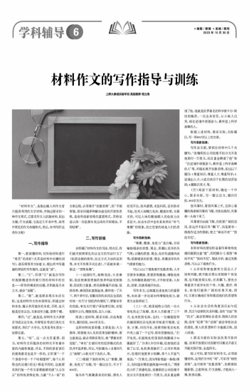 上师大康城实验学校 高级教师 程立海 “材料作文”,是指出题人向作文者只提供利用的文字材料,并指出要求的一种作文形式,它要求作文人依据材料,拟出文题,行文成篇。它是近几年来中考、高考中常见的作文命题形式,那么,如何写好这类作文呢? 一、写作指导 第一,要读懂材料,对所给材料进行“艰苦”的剖析(尤其是材料中关键的词句),进而领悟其主旨意义,理出其中所蕴涵的深层的写作指向,这就是“读”。 第二,“引”。所谓“引”就是在写作时扼要概述你所要引用的材料中的信息——即你所阐述的论题,否则就是无本之木,就会“走题”。 第三,“联”,就是联系现实生活实际,这是材料作文的本质特征,即通过材料本身,揭示其所富含的本质,否则,也只能是空发议论,文章没有力量,显得干瘪。 第四,“议”,就是说,材料作文大多要求写成议论文体,尽管现在考试已淡化文体要求,我们广大学生,尤其是考生朋友一定要注意。 第五,“结”,这一点尤其重要。因为,材料作文所提供的材料无不有着丰富的内涵和寓意,并且,不同的读者读后的视角感受也是不一样的,正所谓“一千个读者中有一千个哈姆雷特”,每个人所得出的论题(结论)都是不同的,这就要求我们每一个作文者都能够突破“人云亦云”的传统思维定势,力避“千人一面”的文章出现,必须展开“发散思维”,即“不囿常规,探求问题多种解决途径的开放性思维,是培养创新思维的重要形式。其特征是从同一信息源生发出来的不同看法,不同结果”。 二、写作训练 在明确了材料作文的写法、特点后,我们就可按照常见的议论文的写法行文了(包括论据的使用、论证方式方法的运用等,本文不作展开式论述)。下面就来做一做这一“思维体操”。 (一)战国时代,商鞅变法,大改秦制。变法使秦国贵族的很多利益受到损害,因此阻力重重。然而商鞅毫不动摇,坚持改革,秦国因此富强起来,最终统一了天下。两千多年后,安徽凤阳的农民在全国农村统一实行计划经济的情况下,冒着坐牢的危险,率先实行联户承包责任制,在短短数年之内,摆脱贫困,迈入小康。 阅读上述材料,联系实际,自选角度作文,题目自拟,1000字左右。 这则材料浅显易懂,主要是说:大力倡导、颂扬敢为人先的改革创新精神。要立意高远,就必须联系现实。敢“冒着坐牢危险”,“率先”打破旧有的经济模式的农民并不是多数。所以,可拟题为:1.且看当代之“商鞅”;2.敢为天下先的人,等。 (二)根据下面的材料,以“寒潮、健康、免疫力”为题,写一篇议论文,不少于800字。 每当冷气寒潮袭来的时候,便有人经受不住,伤风感冒,求医问药,甚至卧床不起,但有人却精力充沛,健康如常,无损无伤。可见人体的健康跟人的免疫力关系甚大。社会生活中也有某些类似“冷气寒潮”的现象,但它危害的却是人们的思路。 写作思路指津: “寒潮、健康、免疫力”是比喻,分别喻指错误的思想、观念、思潮以及坏的风气等;正确的思想、观念,良好的道德风尚等;抵御错误的思想、观念、思潮及坏的风气侵害的能力。 可以从以下视角展开发散思维:人不仅要身体健康,更要思维健康,增强免疫力,当病毒侵袭流行时,才不致受害。人如此,国家、民族焉能不如此。 写作本文,应侧重论述免疫力的重要性,如此进一步论述如何增强免疫力,就更为全面深刻了。 (三)一次,美国福特公司的一台大型电机出了故障,技术人员修理了三个月,也未找到毛病。这时,一位瘸腿驼背的德国移民在电机旁仔细进行观测、记录、计算。时间不长,他便用粉笔在电机外壳上画了一个记号,很有把握地说:“打开电机,在画线处把里面的线圈减少16圈就好了。”许多人半信半疑,但按他的话做了以后,电机果真修好了。公司非常高兴,经理问他要多少报酬,那个人不客气地说:“一万美元,因为用粉笔画一条线1美元,而知道在哪里画线值9999美元。”周围的人听了深感吃惊。但精明的公司经理不但分文不差地照付一万美元,而且重金聘请了他。他就是世界著名的科学家卡尔·斯坦因梅茨,一位出身贫苦,从小被人讥笑,却在逆境中顽强奋斗,最终登上科学高峰的人。 根据上述材料,联系实际,自拟题目,写一则800字以上的文章。 写作思路指津: 写作此文前,要抓住材料中几个关键句:“但精明的公司经理不但分文不差地照付一万美元,而且重金聘请了他”和“在逆境中顽强奋斗,最终登上科学高峰的人”等,并据此展开发散思维,拟出以下题目:1.尊重知识,尊重人才,尊重科学;2.逆境出人才;3.成功来自于长期的刻苦钻研;4.慧眼识英才,等。 (四)阅读下面材料,确定一个中心,联系实际,写一篇议论文,题目自拟,800字左右。 放风筝时,看到风筝上天,总担心紧攥的线牵制风筝的飞翔,当放长线时,风筝却一头栽下来了。 风筝要自由地飞翔,自然要广阔的空间,但这并不是任其“飘飞”,而是要有一根线作适当的限制,使之“牵而不死”“放而不乱”。 写作思路指津: 本则材料的要旨即是看待事物和处理问题要注意“度”,即把握分寸,做到“牵而不死”“放而不乱”。据此分析,通过发散思维,可从以下视角行文。 1.从学校和家庭教育方面论人才培育问题,既不能关得太死限制个性发展,也不能放得太松,任其飘飞。要充分尊重孩子或学生的个性、兴趣、爱好、特长,给他们提供广阔的发展天地,同时,又要正确地引导和规范他们的思