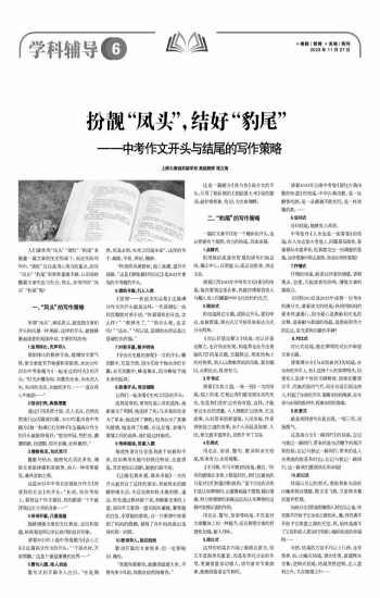 上师大康城实验学校 高级教师 程立海 人们喜欢用“凤头”“猪肚”“豹尾”来衡量一篇文章的优劣和高下。而在实际写作中,“猪肚”往往是用心用力的重点,而对“凤头”“豹尾”则常常重视不够,从而导致整篇文章失色与失分。那么,如何写好“凤头”“豹尾”呢? 一、“凤头”的写作策略 所谓“凤头”,顾名思义,就是指文章的开头和凤凰一样美丽。这样的开头,就能够激起读者的阅读冲动。主要的写法有: 1.运用排比,先声夺人 借助排比的修辞手法,能增加文章气势,使文章富有节奏感和音韵美。如2023年河北中考卷题为《一起走过的时光》的开头:“时光步履匆匆,如歌的生命,如水的人生,如诗的生活,如画的岁月。……一直在我心中流淌……” 2.恰当引用,典雅厚重 通过引用圣贤才俊、名人名言,自然而然地引出话题或扣题。2023年重庆卷中考题为《做一粒满江红的种子》这篇高分作文的开头就做得很好:“怒发冲冠,凭栏处、潇潇雨歇。抬望眼、仰天长啸,壮怀激烈。” 3.整散相见,句式灵巧 整散句结合,能使句式灵活多变,增添文章旋律感和音韵美,给人一种审美感受,兼具音韵之美。 这是2023年中考北京卷高分作文《我读到的北京》的开头:“此刻,坐在考场上,看到这个作文题目,我的眼前一下子就浮现出王大爷的身影……” 4.诗词开篇,凸显底蕴 能够增强文章的文化积淀、品位和底蕴,给阅卷老师以学以致用的良好印象。 请看2023年上海中考卷题为《会心之乐》这篇高分作文的开头:“‘千里冰封,万里雪飘。’这是个银装素裹的世界……” 5.警句入题,给人启迪 警句式的开篇令人注目。“生是偶然,死是必然,生死之间是生命”。这样的句子,凝练、平易、深刻、精辟。 “昨夜西风凋碧树,独上高楼,望尽天涯路。”这是《要做最好的自己》是2023年青岛的中考题的开头。 6.借助开篇,引人入胜 《坚韧——我追求的品格》这篇满分作文的开头就是这样:一代高僧弘一法师涅槃前对弟子说:“你看看我的牙齿,怎么样?”“都掉光了。”“那舌头呢,还在吗?”“还在。”“所以说,坚韧的东西总是比坚硬的东西强。” 7.对称开篇,整齐明快 《学会历史般的旁观》一文的开头:蝶的眼中,花是天使,因为花给予她生命的甘露;在花的眼中,蜂是挚友,因为蜂给予她生命的延续。 8.故事开头,简洁铺陈 让我们一起来看《生死之间》的开头:选择是难的,更何况是心灵的选择。高渐离为了荆轲,他选择了死;马本斋的母亲为了革命,她选择了牺牲;祝英台为了真挚的爱情,她选择了化蝶。在这友情、亲情与爱情之间的选择,他们是这样做的。 9.传神描绘,形象入题 描述性语言往往容易流于刻板和平淡,但如果考生能巧妙抓住特征,注意借鉴,灵活地加以创新,就能打破平淡。 《让睫毛载来爱,载来幸福》一文的开头就符合了这样的要求:我曾用水的眼睛审视生活,生活也曾如秋水般阴郁、遥远。阳光透过枫林洒下来,我顺着光束向上望,却似乎又看到一望无际的蒹葭,雾雪般的白色,水草般的柔软。在一片渺渺中我看到了妈妈的眼睛,看到了当年妈妈做出选择的那一刹那。 10.歌词导入,贴切自然 歌词开篇的文章很多,但一定要贴切、确当。 “我爱你爱着你,就像老鼠爱大米。不管有多少风雨,我都会依然陪着你。” 这是一篇题为《我与你》高分文的开头,引用了杨臣刚的《老鼠爱大米》里的歌词,就非常形象、恰切,为文章增辉。 二、“豹尾”的写作策略 一篇好文章不仅有一个精彩的开头,也必然要有个简明、有力的结尾。具体来看: 1.点睛式 即用简洁或富有哲理的语句归纳总结,揭示中心,点明意义;或议论收束,突出主旨。 请看江西2023年中考作文《合影》的结尾:每次看到这张合影,我就仿佛看到老人与糖人身上闪耀着中华文化的灼灼光芒。 2.照应式 即结尾照应文题,或照应开头,前后呼应,血脉贯通。照应式又可按具体表达方式分为两种。 《勿以好恶论断之》结尾:勿以好恶论断之,也许你会发现,狗尾草也会开出美丽的花!结尾点题,文题照应,形成结构上的对称美,给人以清晰深刻的印象,紧扣题目,点明论点,收束有力。 3.升华式 请看《文武之道,一张一弛》一文的结尾:综上所述,忙能让我们感受到生活的充实,但是我们的忙应有张有弛,这样,才能保证生活的质量,人人都能忙出效率,忙出成果,从而带来国家富强,人民幸福。作者将张弛之道的效果,由个人而延及国家、人民,使文意丰富深化,自然升华了主旨。 4.引用式 用名言、俗语、警句、歌词和诗文结尾,收束有力,余音绕梁。 《不可靠,不可不靠》的结尾:最后,“所有的感情在本性上都是好的,我们应避免的只是对它们的滥用和误用。”笛卡尔也告诉我们在认知事物时,应谨慎地基于理智,辅以情感,努力使感情的亲疏远近在认知事物的过程中发挥正面的作用。 用名言、警句、俗语等结尾,不仅是对文章整体上的一种提升,而且使得文章的哲理性加强,耐人寻味。 5.排比式 这样的结尾在内容上能照应前文,但又不是简单的重复,而是有深化主旨的作用,更兼语意亲切感人,语句富有节奏韵律,能使阅卷者击节称叹。 请看2023年云南中考卷《留住古典诗歌的味道》的结尾:中华古典诗歌,是一坛醇香的酒,是一朵葳蕤不败的花,是一杯淡雅的茶。…… 6.设问式 设问结尾,能够发人深思。 中考佳作《人生也是一张答卷》的结尾:在人生这张大考