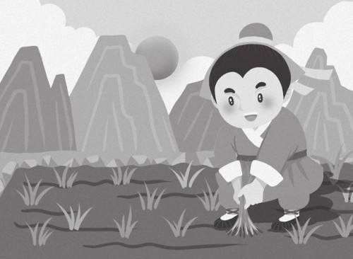 春秋时,有个急性子农夫,他插下秧苗后,好几天也不见秧苗长高,心里着急,就把自己田里的秧苗挨个都拔高了一些。他累得筋疲力尽,回到家里,得意地对儿子说:“我干了一天,总算帮助秧苗长高了一些。”儿子连忙跑到田边去看,只见秧苗全都被太阳晒得枯死了。