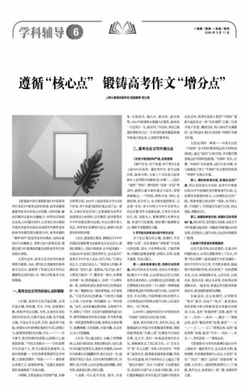 上师大康城实验学校 高级教师 程立海 《普通高中语文课程标准》《中国高考评价体系》中都有这样的表述:高考命题要着重考查学生有效认识问题、分析问题、解决问题所必备的关键能力、学科知识和综合品质。以问题为导向、以具体任务为驱动并进而考查学生综合品质或学科素养是本轮高考命题改革的重要方向。高考命题的“素养导向”就是考查学生调动、运用必备知识与关键能力、思维方法与思维品质、情感态度与价值观高质量完成特定学科任务的综合表现。 正因为这样,高考议论文的写作就显得格外重要。为此,要写出文质兼美的高考高分议论文,就要明了考场议论文写作应遵循和达成的核心点、增分点等基本方法和策略。 一、高考议论文写作的核心点和策略 1.扣题。高考作文经不起沉默,必须反复点题,即标题、开头、中间、结尾都扣题,渲染并突出话题。当然,这里的反复也是相对而言的,它既不是乱点题,也不是滥点题,不宜也不必过多,否则,就会弄巧成拙。请看2023年新课标卷高分文《以故事之力,叙家国深情》的点题:开头——“……当今青年,更当传诵好的故事,以故事之力,叙家国深情。”中间主体部分——“好的故事不仅启迪个人,更可以彰显民族情怀,弘扬中国智慧……好的故事更需要听见并传播,凸显家国情怀。”结尾——“……愿吾辈以故事之力,叙家国深情。”这篇文章就恰到好处地做到了反复点题。 2.明晰。主要是指全文结构严谨、思路分明等方面。2023年上海高考高分作文《始于好奇,终于热爱》就很好地达成了这一要求:文章在肯定好奇心在探索陌生世界中发挥驱动力的同时,以布鲁诺、钱学森等古今中外的典范事实论据,对论点展开深入浅出、环环相扣的阐发与论证,能够引发读者的共鸣和共情。 3.充实。就是要以典范、新颖的古今中外的理论论据和事实论据来充分论证论点,做到以理服人。《独木难成林,合作促共赢》一文是2023年全国乙卷优秀作文,全文运用了诸多古今中外名人名言,如孔子的:“己欲立而立人,己欲达而达人。”英国诗人约翰·多恩的话:“没有人是一座孤岛,可以自全。每个人都是大陆的一片,整体的一部分。如果海水冲掉一块,欧洲就减小。如同一个山岬失掉一角,如同你的朋友或者你自己的领地失掉一块。”魏源的话:“孤举者难起,众行者易趋。”习近平总书记的教诲:“只有把小我融入大我,才会有海一样的胸怀,山一样的崇高。”此外,还有张骞出使西域、玄奘西行天竺、郑和七下西洋、马克思与恩格斯的通力合作、管仲和鲍叔牙的相互成就、乔布斯和盖茨一笑泯恩怨等事实论据,使得全文旁征博引、纵横捭阖、引经据典,内容丰赡,论证有力,令人不容置疑。 4.文采。可以通过排比、比喻、引用等修辞,以及恰当的动词、形容词和反问、设问、感叹与双重否定等句式,做到文采斐然。如2023年天津满分文《鲲鹏作伴,青云为志》一文,就借助引用名人名言、古诗文和自创排比句、对偶句、拟人句等,让全文呈现出语言典雅、词采华茂,给读者以赏心悦目之感。 5.创新。可以是书信体、剧本、访谈体、实验报告、镜头式、寓言体、童话体等。2023年新课标II卷题为《爱我,就给我一方空间》一文,就采用了书信体,将自己渴望和期盼有自己一方空间的强烈愿望淋漓尽致地凸显出来,让读者印象深刻。 二、高考议论文写作增分点 1.应努力做到结构严谨,说理透辟 《源于好奇,发于热爱,终于责任》是上海2023年高考一篇优秀作文,该文过渡自然,脉络分明。文章上下文的语义起承转合上运用得当的路标词,如第二、三段的“诚然”“然而”,第四段的“而进一步说”等词句,就明示着文章的观点与层次,显得思路畅达,一气呵成,浑然天成。同时,论据经典,充分有力。全文既有爱因斯坦、马克斯·韦伯、李大钊等古今中外圣贤伟人的名言警句作为道理论据,又用信手拈来的凡·高、居里夫人、梁漱溟等人的事实论据,来进行引经据典、旁征博引地阐释论证,增添不容置疑的力量。 2.尽可能在多维度比较中深化论证 为了论证观点的正确,说理时,不仅需要“比较”,而且强调在“多维度”中完成比较说理。因为,只有多维比较,才能把事物、问题的道理说清楚、讲明白,否则,说理不透彻,不足以服人。 第一,纵向多维度比较,助推论证的深度。即以时间先后为坐标,包含古今维度比较(观古今于须臾,以此推导出它们之间的差异点或共同点,从而增加论证的深度)、前后期维度比较(对同一个人或同一种事物前后期表现出的不同特点进行比较,从而好坏优劣,不言自明)、代际维度比较(对两代人之间表现出的不同特点进行比较,从而是非得失,一目了然)等。 以2019年上海卷中国文化与中国音乐的“中国味”材料作文的片段为例: 诚然,面对中国文化,我们失去过。敦煌壁画的失传是无知者酿造的惨剧,圆明园被焚烧是“天朝上国”的朝廷不自知的后果。这几年,我们一味地追求国外的文化,却渐渐淡忘了自己的文化。从“文化失守”到“本土式微”,中国人的生活中,“中国味”退居次位。眼看着老建筑被推翻,传统节日不受重视,终于有些有识之士提出了要“留住中国味”,所以“汉服热”才会席卷而至,故宫的文创产品才会成为网红款,令它们重新崛起的不仅仅是它们创新与传统结合的品味,更多的是国人看到“中国味”重新兴