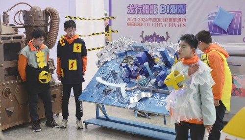 2024年3月9-10日,2023-2024年度DI创新思维活动在浙江宁波国际会展中心举行,来自全国近20个省(市)的近200支队伍参加了此次活动,展示了DIer非凡的创新力和综合素养。上海共有70支队伍总计600多人带着奇思妙想的道具装置,通过富有感染力的激情表演,讲述了一个个充满想象力又符合逻辑的故事,让活动现场响起阵阵掌声和欢呼。经过两天的激烈比拼,上海青少年共计斩获22个一等奖,21个二等奖,22个三等奖,33个特别奖。一座座被举起的奖杯,不单单是单个团队的荣誉,更是上海青少年在科技创新领域一骑绝尘的整体实力体现。 记者 孙琪 摄影 郭容 龙年开门红,创意力爆棚 在DI一次次展示活动中,孩子们发现只有通过大胆创新、大量实践和有效地反思与改进,才能呈现自己想象中最美的作品。 上海市大同初级中学“创意有限”代表队参加的项目是:C艺术类挑战-动态运转,“创意有限”代表队都来自于大同初级中学OM与DI社团,他们这次设计的剧情讲的是“爱美之神”“工匠之神”为了在雅典城谁来制造雕像而展开一系列的明争暗斗。 “我们用瓦楞纸和铝合金制作了一个特洛伊木马,在他的腿上我们用曲轴连杆制作了一个装置,使它能够自动地运转行动,就像在行走一样。”队员们告诉记者,他们还制作了音响装置系统,对应观众的状态可以放出欢呼和惊叹的声音。因为需要重塑艺术作品,队员们调查了很多资料,还进行了“教师总动员”:“我们剧本修改请教语文老师,舞美走台请教音乐老师,形体请教体育老师。” “本次比赛是我校队伍第一次异地参加比赛,遇到了很多困难。首先是道具打包,当要装上货车的时候才发现,我们制作了这么多东西啊!全部要用防震棉包起来。大家花了三天时间,出发前一天更是打包到半夜。队伍里的两个同学患上了严重的感冒,他们顶着虚弱的身体完成了比赛。”队员说。 即时挑战需要比拼手上功夫,队员们就每天练习搓纸棍,“一张A4纸,队员李秋彤开始一分半钟只能搓成60公分长的纸棍,到后来能搓到110公分,她在家里练习的纸棍都能堆成塔。”“我因为DI训练推掉了数学课、小提琴课甚至最喜欢的帆船课。”队员金锐尘感激曾经努力的自己和团队,他们最终捧得达芬奇奖和即时挑战第一名。 锻造“梦之队”,比拼综合素质 在DI全国的舞台上,学生的综合素质,如服装道具的设计制作能力、现场操控能力、短剧创作能力和表演能力都得到了充分展示。 “华曜梧桐,DI翱翔!”在“E工程类 射程挑战”的竞技场外,上海民办华曜初级中学“星河小队”的队员正喊着口号为团队打气!领队张成山老师告诉记者,学业与科创活动时间冲突,孩子们就在放学后留在学校的劳技实验室进行剧本创编,开展场景的技术性切换和道具的配合。好多个周末,孩子们会为了某一次的灵感乍现齐聚学校。来宁波前,队员们曾为是否要重新设计投石车以及故事情节,产生了争执。热爱让他们很快达成一致:大家提升学业完成速度,利用周末一起进行更新迭代。在无数个为DI奋斗的日夜中,队员之间的小伙伴关系更加融洽,师生之间的亦师亦友情谊也更加深厚。 上海市工业技术学校的“是男人就保持睿智”参加了“E 工程类 射程挑战”的竞技,七名队员合作编创这样一个故事:一个数码世界,因一次巧合封印千年的病毒被释放,世界陷入了混乱,三个程序与睿智少年一同拯救世界,齐心协力打败病毒,保卫了世界和平。 领队姜凯丽老师告诉记者,道具是队员们共同策划制作的,大键盘、场景板和投石装置,巧妙利用青少年喜爱的数码和网络元素,让剧情和必要装置紧密结合起来。姜老师认为相对成绩,让她更骄傲的是孩子们的成长:“编剧时,他们起过争执,排练时,发生过摩擦,但是他们通过自己的方式解决了矛盾。”队长钟喆也坦言:“奖杯是我们相互学习、相互帮助的成果,是对我们创作和表演的肯定,也是我们友谊的见证!” 【获奖者说】 领悟“谦让和共进” 上海市向明中学“土豆爆炒马铃薯”队的队员徐笑宇告诉记者,他和6位同学一起参加了“D即兴类 特殊演员”高中组比拼,这次团队里有3位“老将”坐镇,可突发状况还是让他们措手不及,“入场前,我们全队都很紧张,演主角的我坐立不安,一名女同学突然流鼻血。”“加油,伙计!”让他更加意外的是入场时,刚表演完的北京清华附中的同学为后来者鼓劲。这声声“加油”,让团队镇定下来,队员之间互相鼓励,完成了心目中最完美的作品,最终取得了即兴挑战和总分双料第一的成绩,徐笑宇说:“在DI这个舞台上,我们真正感受到‘友谊第一’的温暖,领悟到‘谦让和共进’的真谛。”