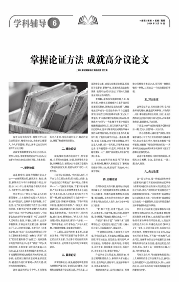 上师大康城实验学校 高级教师 程立海 高考议论文的写作,需要对中心论点进行适切、精准的论证,才能够以理服人,令人不容置疑。那么,高考议论文如何展开有效论证呢? 这就要熟练掌握常见的论证方法,以便深入浅出、有理有据地论证中心论点,让读者对你的文章论点深信不疑。具体来看: 一、举例论证 这是最常用、说服力很强的论证方法——在亮明观点后,就用真实、贴切、典型、新颖的古今中外的事例进行例证、析理。以2023年上海高考佳作《既有好奇心,亦有责任心》的片段为例: 何为责任心?责任心可以是人们的爱国情怀、人文情怀抑或是对人类的大爱。在中国近代,这种例子数不胜数。为了救国,为了改变中国落后于西方任人宰割的现状,无数中国“思想觉醒”的先进知识分子立志“为中华之崛起而读书”。中国著名的农业科学家袁隆平,为了让全世界人民吃得上饱饭,怀着人文情怀,立志并不断探索,开辟出杂交水稻之路,最终解决了几亿人的吃饭问题。还有历史上许多医学家,如“医圣”东汉的张仲景写出了传世巨著《伤寒杂病论》;被称为“药圣”“药王”的孙思邈所著《千金要方》,是我国最早的医学百科全书;还有“神医”华佗;英国医学家、生物学家,进化论的奠基人达尔文;以及写出《本草纲目》的李时珍,还有疫情期间研制抗疫特效药的药学家、医学家。他们夜以继日攻坚克难地研发医药,就是因为他们有着对人类的大爱,救死扶伤的家国情怀。 该生通过例举古今中外、不同领域的名人事例,对论点进行充分、典范的论证,增强了权威性和说服力。 二、理论论证 就是借助经典的名言名句、科学原理、众所周知的道理、谚语、俗语等作为论据,来阐释论点。请看2023年全国乙卷题为《和衷共济促发展,美美与共天下同》一文的片段: 习近平总书记指出:“吹灭别人的灯,并不会让自己更加光明;阻挡别人的路,也不会让自己行得更远!”独木难支,众擎易举……“一花独放不是春,万紫千红春满园。”正如著名社会学家费孝通先生总结出的“各美其美,美人之美,美美与共,天下大同”一样,我们应该海纳百川、包容并举……让我们记住《中庸》中的教诲:“万物并育而不相害,道并行而不相悖。”一家独大,看似前路光明,却是绝路的开端;百花齐放,方能迎来春色满园。“当大雪降下,冷风吹起,独行狼死,群聚狼生。”躬身入局,我们当同心同力、和衷共济,谱写时代华章。……“孤举者难起,众行者易趋。”只有众星汇聚,才能星空璀璨,迎来美好的明天。 可以看出,这位考生积累丰厚。这就启发考生:平时不仅要善于储备所学、所记的古诗文名家,又应善于灵活运用到所写文章中去,适时得当地为你的文章增光添彩。 三、因果论证 所谓因果论证,就是通过对事理原因与结果的严谨分析,来对论点正确性、科学性和合理性进行论证的方法。其特点是:从原因推论结果,或是从结果探求原因,即是探寻出事情、事物产生、发展的来龙去脉和规律,进而对论点加以论证。下面的文段就是运用此法而写成的: 有时候,磨难恰恰能够历练人生,绽放光彩。史铁生双腿瘫痪并且患肾病进而发展到尿毒症,但他在母亲的关爱下,勇敢地生活并成为一位励志作家;司马迁遭受宫刑,却能在这样的耻辱中写成《史记》,汗青溢光,于诽谤讥嘲中坚持自己的志向,突围成为“史圣”;一代体操王子李宁泪洒汉城黯然退出体坛后,却又另辟天地开创了自己的事业,让李宁牌系列运动用品风靡中国的体育用品市场,那是因为他不为失败所吓倒,才能在失败中开拓出一条新路。磨难,是祸,又是福。它对于意志坚强者,只不过是人生路上的一帘风雨,只要勇敢地走过去,前方就是另一片蓝天,从而迎来“柳暗花明又一村”,拥有“病树前头万木春”的美好未来。 上文就恰到好处地运用了因果论证,条理分明、鞭辟入里地论证了“磨难恰恰能够历练人生,绽放光彩”的论点,令人深信不疑。 四、比喻论证 在写作议论文的时候,能够贴切地运用比喻论证,不但能够使说理生动形象,且可以将抽象、深奥的道理阐释得浅近易懂、明白晓畅。在我们所学的课文中,就有许多运用此法的名人名作,如《劝学》中的以下段落: “青,取之于蓝,而青于蓝;冰,水为之,而寒于水。木直中绳,輮以为轮,其曲中规。虽有槁暴,不复挺者,輮使之然也。……” 作者以“青胜于蓝”“冰寒于水”说明事物经过一定的变化,超过了以前,比喻人经过学习,可以提高自己,超越别人。 “吾尝终日而思矣,不如须臾之所学也;吾尝跂而望矣,不如登高之博见也。登高而招,臂非加长也,而见者远;顺风而呼,声非加疾也,而闻者彰。假舆马者,非利足也,而致千里;假舟楫者,非能水也,而绝江河。君子生非异也,善假于物也。” 作者从生活实际出发,借助比喻,来论证利用和借助外力、条件所具有的重大作用,进而得出人借助学习,就能够弥补不足,获得显著的成效。 需要注意的是:运用比喻论证,两事物之间需要有类似之点,即可用一事物比喻另一事物,从而论证一个比较抽象的事理。 五、对比论证 这种论证方法,具有泾渭分明、令人印象深刻的特点。就是把两种事物、人物或同一人物、事物前后等加以对照、比较,由此自然推导出它们之间的不同与差异,凸显本质和特征,孰是孰非,不言自明。 下面是2023年全国II卷题为《静坐浮世一隅,沉淀人世繁华》