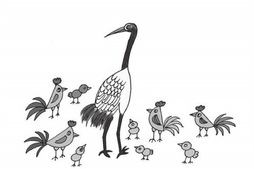 草地上有一群鸡。其中一只大公鸡,夸耀自己强壮,羽毛金黄亮丽,最为出众。另一只芦花大公鸡不以为然,说自己打起鸣来,声音嘹亮,才是最优秀的。就在它们互不服气,要打起来的时候,一只仙鹤突然从天而降,落在鸡群中,两只公鸡相形见绌,不再争斗了。