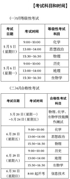 记者 郭漪 日前,上海市教育考试院正式发布关于做好2024年上海市普通高中学业水平考试报名工作的通知,安排2024年上海市普通高中学业水平考试的5月等级性考试和6月合格性考试报名工作。今年5月等级性考试时间为5月5日、5月6日。自2024年起,等级性考试成绩均当年有效。 等级考成绩当年有效 5月等级性考试设思想政治、历史、地理、物理、化学、生物学6门科目。考生可根据高校招生要求和自身兴趣特长,在6门等级性考试科目中自主选择3门参加考试。合格性考试成绩不合格的考生不得报考对应科目的等级性考试。 考生报名参加本市统一高考当年,若同时选择报考等级性考试,其选定的等级性考试不得超过3门科目,且均只能参加一次考试,报考后不可更换考试科目。 据悉,合格性考试“合格”成绩始终有效。自2024年起,等级性考试成绩均当年有效。 2020学年及之前入学的本市高中在籍学生,获得的等级性考试成绩有效期按照《上海市教育委员会关于印发<上海市普通高中学业水平考试实施办法>的通知》(沪教委规〔2018〕6号)执行,其等级性考试成绩保留至2024年有效。 2022年及之前获得的等级性考试成绩的“其他考生”,等级性考试成绩有效期按照《上海市教育委员会关于印发<上海市普通高中学业水平考试实施办法>的通知》(沪教委规〔2018〕6号)执行;“其他考生”在2023年获得的等级性考试成绩,保留至2024年有效。 国际课程班需参加4门合格考 6月合格性考试设思想政治、历史、地理、物理、化学、生物学和信息技术7门科目。其中,物理、化学、生物学3门科目含技能操作测试。 高一年级在校生可报考的合格性考试科目为:信息技术。高二年级在校生可报考的合格性考试科目为:思想政治、历史、地理、物理、化学、生物学、信息技术。 在高一、高二年级未取得合格性考试合格成绩的在校生可向其学籍所在学校申请报考相应科目的合格性考试。因休学等原因在籍但不在校就读的学生不得参加报考。 其他考生可自愿报名参加高中学业水平考试思想政治、历史、地理、物理、化学、生物学、信息技术7门科目的合格性考试,但无需报考物理、化学、生物学3门科目的技能操作测试。 根据《上海市教育委员会关于印发<上海市普通高中学生学籍管理办法>的通知》(沪教委基〔2014〕22号), 经体育行政部门和教育行政部门确认的学生运动员,参加本市普通高中学业水平考试可选考6门科目(其中思想政治、语文、数学、外语为必考科目)且考试成绩合格是获得毕业证书的条件之一。国际课程班学生参加本市普通高中学业水平考试思想政治、语文、历史、地理科目考试且成绩合格是申请毕业证书的条件之一。 其中,物理、化学、生物学技能操作测试,以及信息技术科目的具体考试时间以准考证为准。